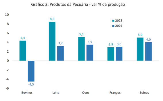 As projeções para a produção de aves, suínos e ovos em 2026, por sua vez, são de crescimento, com alguma variação em torno de sua média histórica (ver gráfico 2). Isso, no entanto, não deverá compensar a quedas previstas para o abate de bovinos e a desaceleração da produção de leite, em função do peso desses produtos no valor da produção.