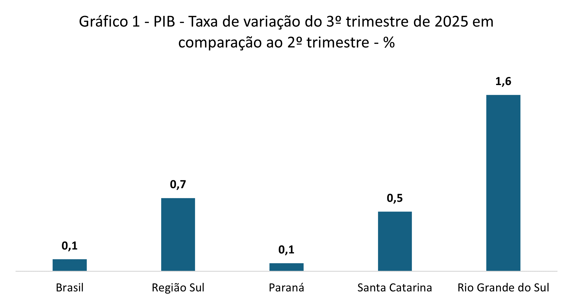 O crescimento do PIB da região Sul (0,7%) acima do nacional (0,1%) no 3º trimestre de 2025, em comparação ao 2º, deve-se principalmente ao forte crescimento gaúcho (1,6%). Além dele, os desempenhos positivos em Santa Catarina (0,5%) e no Paraná (0,1%), também contribuíram para o bom desempenho regional da atividade econômica.