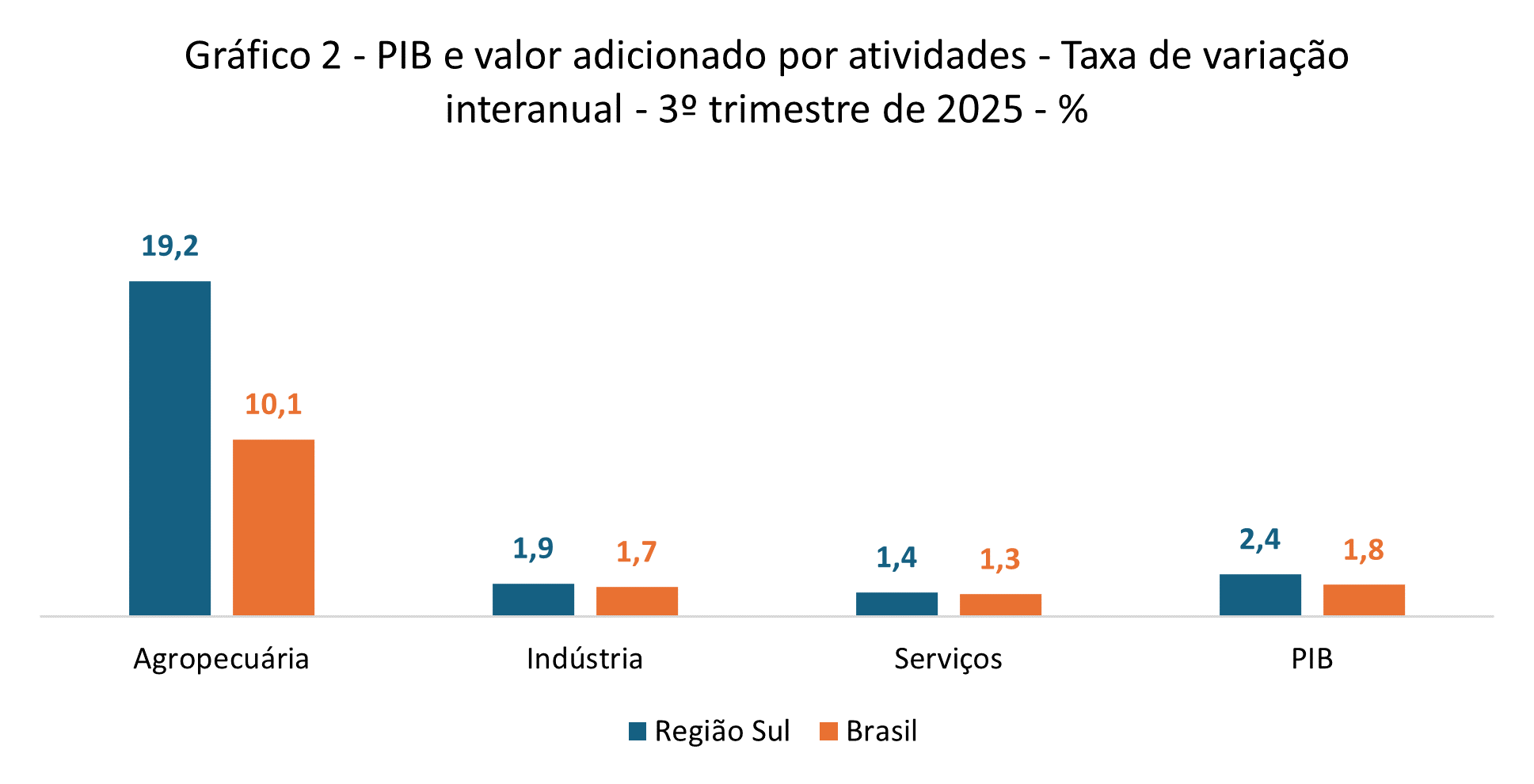 O crescimento do PIB da região Sul foi de 2,4% no 3º trimestre, em comparação ao mesmo período de 2024; também acima do 1,8% divulgado pelo IBGE para o PIB nacional. Houve crescimento no valor adicionado das três grandes atividades econômicas na região, sendo o maior deles, o da agropecuária (19,2%). Destaca-se que o desempenho da região Sul foi superior ao nacional não apenas no PIB, como também em todas as atividades analisadas, como pode ser observado no Gráfico 2.