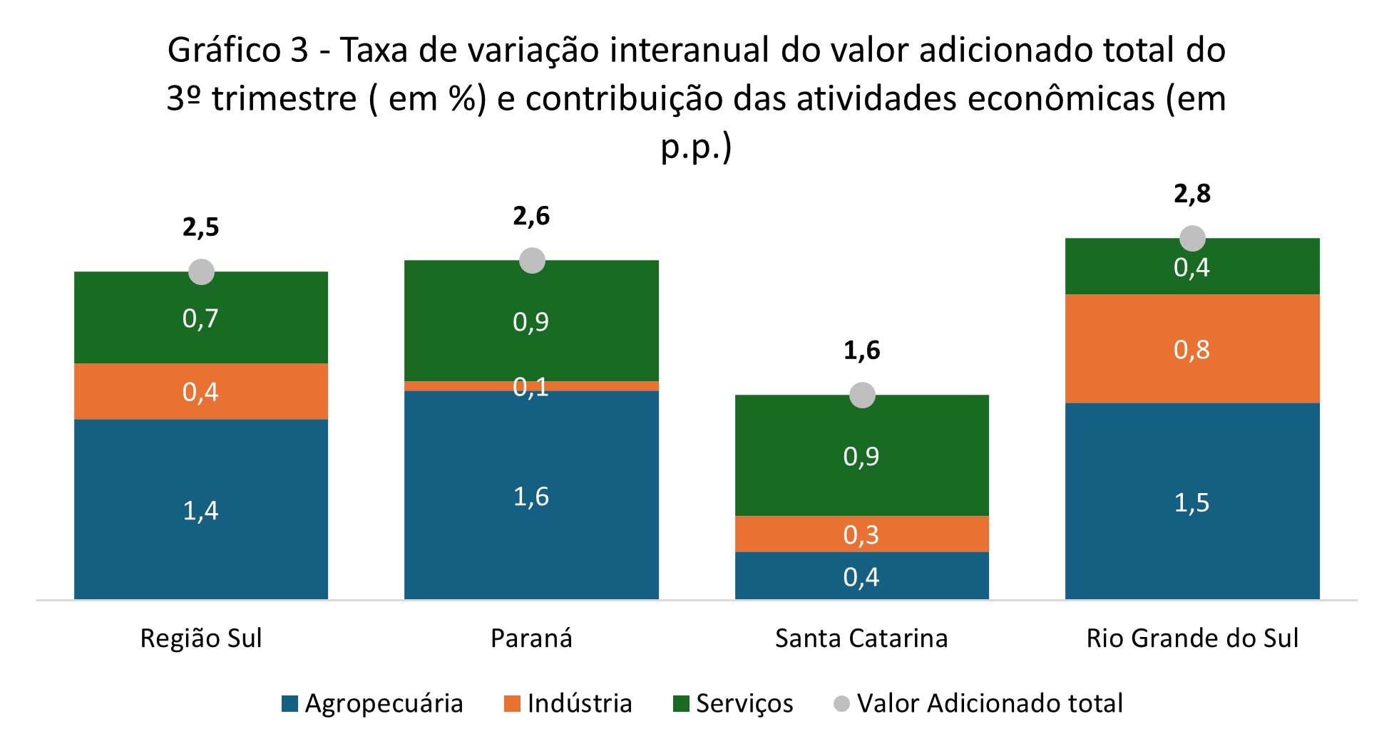 O Gráfico 3, que apresenta a contribuição das atividades na taxa de variação trimestral interanual do 3º trimestre de 2025, mostra que a agropecuária foi a principal atividade a contribuir para o crescimento do total do valor adicionado tanto da região Sul, como do Paraná e do Rio Grande do Sul, representando mais da metade de seu crescimento nesses locais. Em Santa Catarina esta atividade também teve contribuição positiva, porém o setor de serviços foi a maior contribuição positiva para a economia do estado.