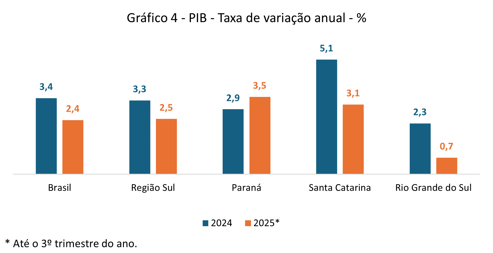 PIB da região Sul cresceu 0,7% no terceiro trimestre de 2025, ante o segundo trimestre, ritmo superior ao 0,1% do PIB nacional. Rio Grande do Sul foi o estado que mais contribuiu para o crescimento do PIB sulista foi no 3º trimestre, com 1,6%.
