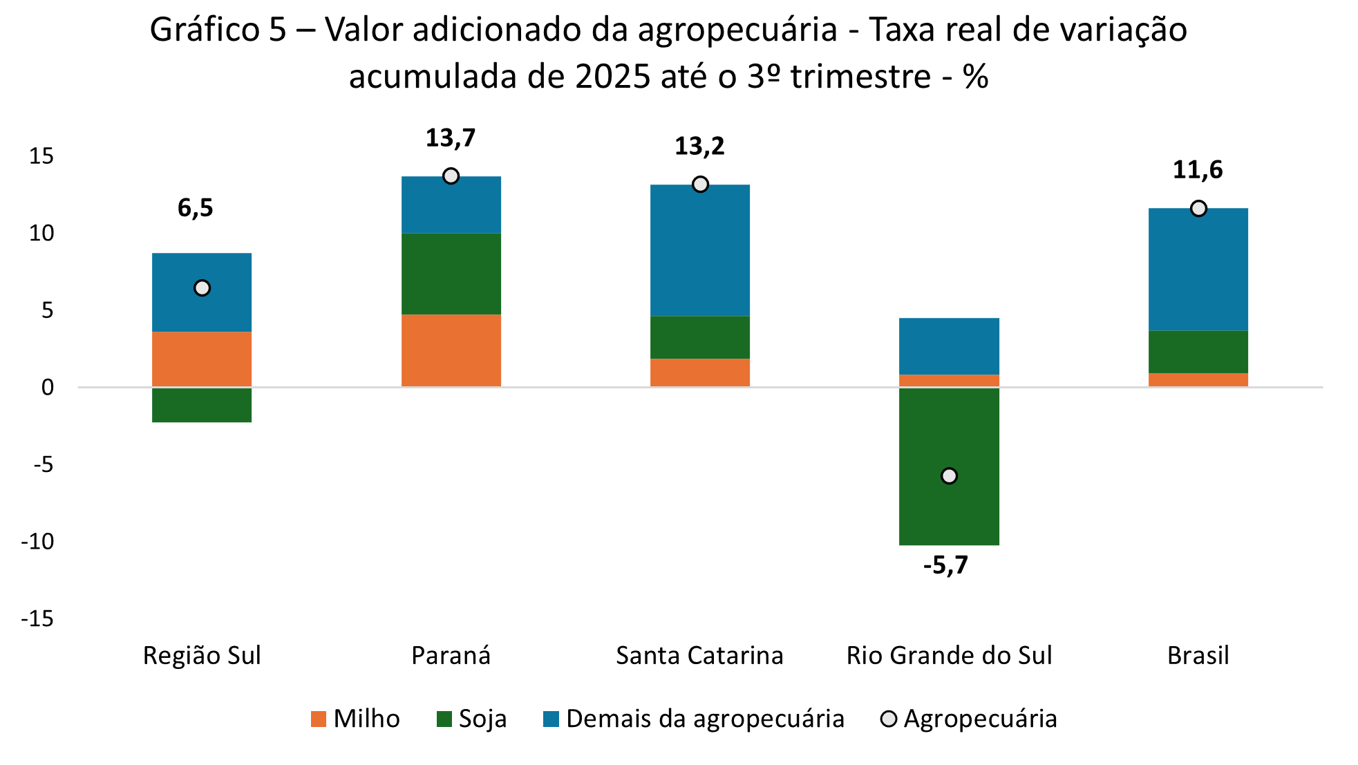 No Paraná, cerca de 70% do crescimento do valor adicionado agropecuário deveu-se as lavouras de milho e de soja. Em Santa Catarina, além desses cultivos, o fumo também foi importante para o desempenho positivo da atividade; em conjunto, estas três lavouras responderam por cerca de 70% do crescimento do valor adicionado agropecuário catarinense. No Rio Grande do Sul, a retração deve-se a queda no cultivo de soja, sendo este recuo atenuado pelos bons desempenhos no cultivo de arroz e de fumo.