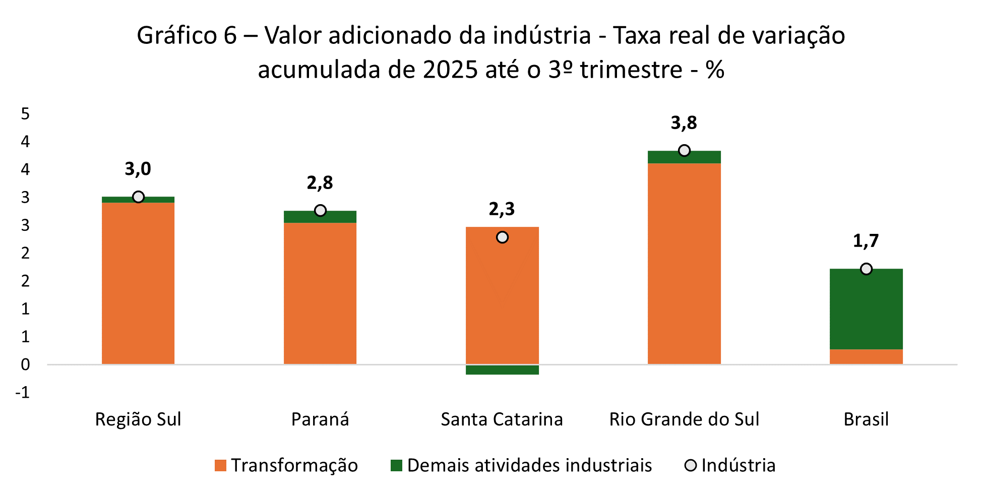 Destaca-se o desempenho da transformação, tendo sido a atividade que mais contribuiu para o crescimento do valor adicionado industrial do Sul ao longo de 2025, padrão observado em todos os estados da região, porém diverso do nacional, onde as indústrias extrativas foram as que mais impulsionaram o crescimento industrial.