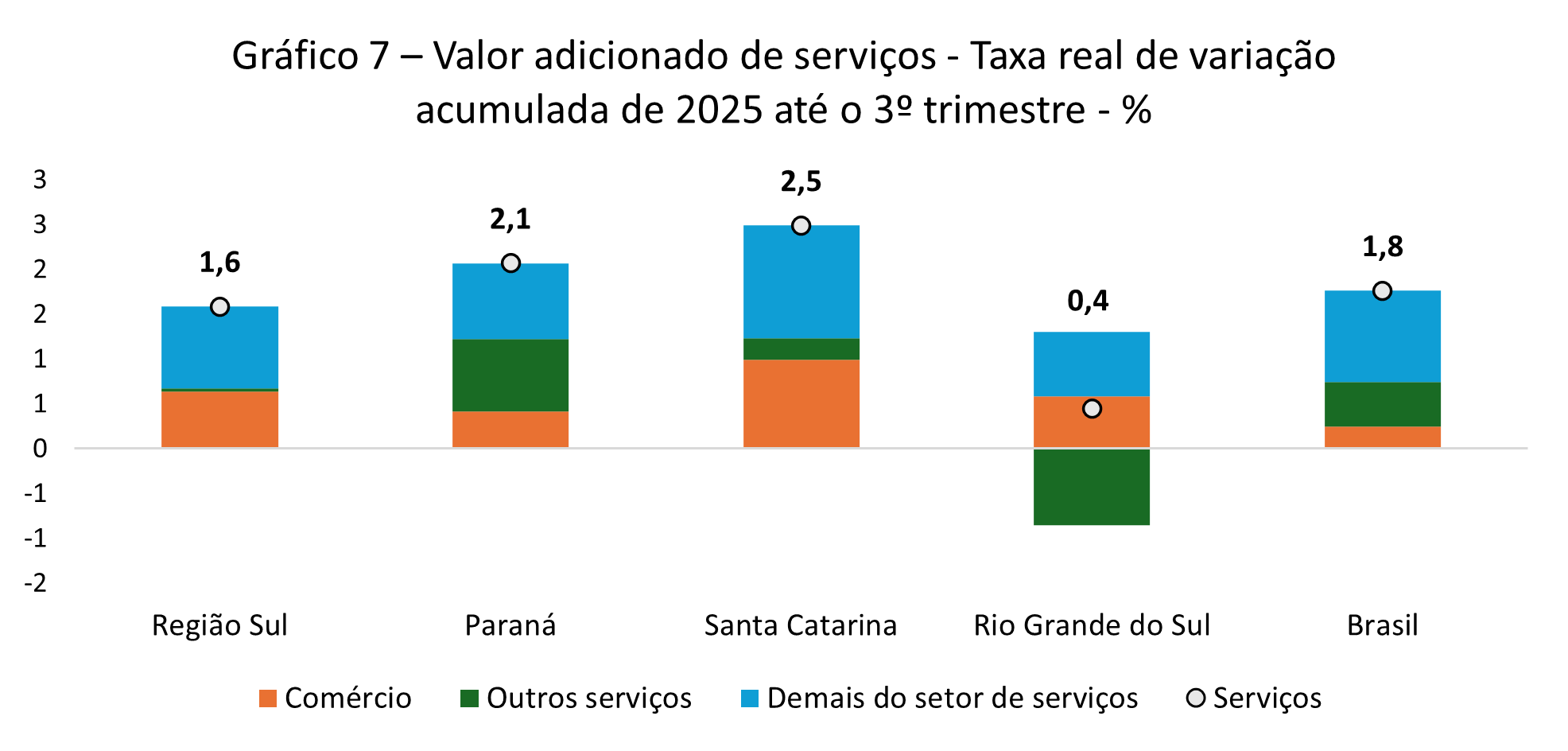 O valor adicionado do setor de serviços cresceu 1,6% na região Sul, no acumulado de 2025 até o 3º trimestre do ano, o que gerou contribuição de 0,9 p.p. para o crescimento do PIB sulista no período.
