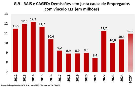 Como se pode ver no Gráfico 9, as demissões sem justa causa, depois de alcançar um pico em 2014, foram se reduzindo, e se estabilizaram em torno de 9 milhões entre 2018 e 2020. Em 2021 atingem o menor valor da série histórica, mas registram uma forte alta no ano seguinte — provavelmente um efeito do Programa Emergencial de Manutenção do Emprego e da Renda, citado anteriormente. Já em 2023 chegam a um nível quase 1,1 milhão de ocorrências maior do que o visto em 2019 — aqui utilizado por base de comparação por não ser influenciado pelos efeitos da pandemia. As demissões sem justa causa voltaram a crescer em 2024 e, segundo estimativas realizadas com base no CAGED, também em 2025.