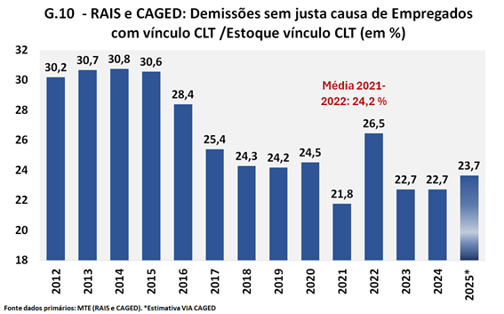 E como esses números se comparam ao estoque dos vínculos CLT? No gráfico 10 é mostrada a relação entre as demissões sem justa causa e o estoque em 31/12 desse tipo de vínculo. O que é interessante notar, nesse gráfico, é que a relação entre o número de demissões sem justa causa sobre o estoque de vínculos não apresentou nenhuma anomalia nos últimos anos, a não ser em 2022 — o que pode ser um impacto da transição da forma de coleta da RAIS. Mas uma avaliação mais precisa do que ocorreu naquele ano exige investigação adicional.