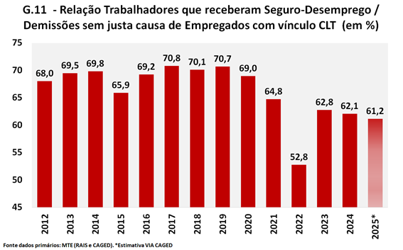 Para finalizar, falta a comparação entre o número de trabalhadores que tiveram acesso ao seguro-desemprego e a quantidade de demissões sem justa causa dos “trabalhadores CLT”, exibida no Gráfico 11.