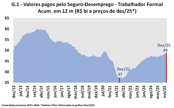 O Gráfico 1 traz os gastos acumulados em doze meses com o pagamento do seguro-desemprego Trabalhador Formal1; os dados são disponibilizados pelo Ministério do Trabalho e Emprego e os valores foram trazidos a preços de dezembro de 2025, utilizando o IPCA como deflator.
