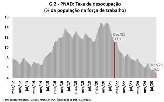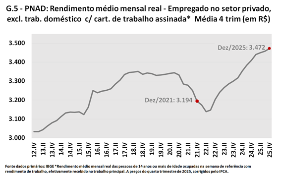 E esse aumento é compatível com a evolução das remunerações dos empregados: segundo a PNAD, a média móvel do rendimento médio real dos empregados no setor privado (exclusive trabalhadores domésticos) com carteira assinada aumentou de um pouco menos de R$ 3,2 mil para quase R$ 3,5 mil entre o final de 2021 e o final de 2025 (ver Gráfico 5), o que corresponde a uma variação de 8,7%.