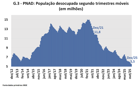 Nesse mesmo intervalo de tempo, porém a Taxa de Desocupação caiu — e muito —, passando de 11,1% para 5,1% da População na Força de Trabalho. Por trás dessas taxas, uma redução de mais de 6,3 milhões no número de pessoas desocupadas (Ver Gráficos 2 e 3).