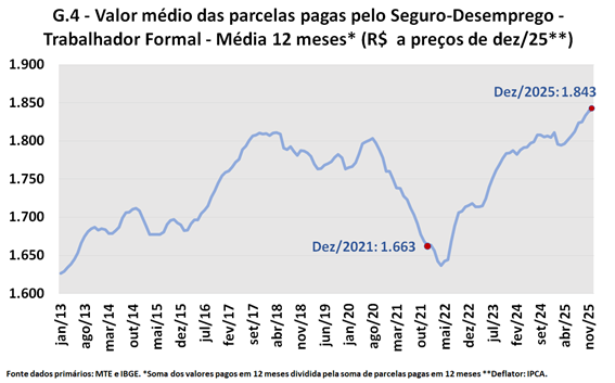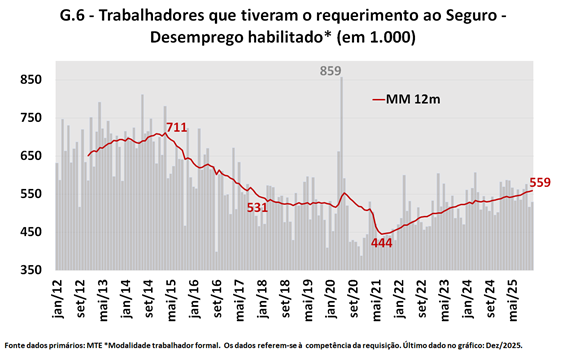 A partir de então o número de trabalhadores recebendo seguro-desemprego apresentou crescimento quase monotônico, e a média móvel 12 meses da variável atingiu quase 560 mil no final de 2025, o maior valor desde outubro de 2017. Em relação ao observado no final de 2021, a comparação dos números indica um crescimento de 22,7%.