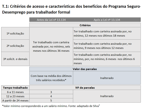 A partir de abril de 2015 o número de trabalhadores habilitados passou a cair: a média móvel 12 meses, que atingiu o patamar de 711 mil trabalhadores em março daquele ano, declina consistentemente até o início de março de 2018, mantendo-se até o final de 2019 em torno de 530 mil trabalhadores. Como aponta Silva, tal redução deveu-se em grande parte à aprovação da Lei 13.134, que tornou mais rígida a concessão do benefício. A Tabela 1, abaixo, traz um resumo das condições vigentes para a concessão do benefício antes e depois da alteração da legislação.