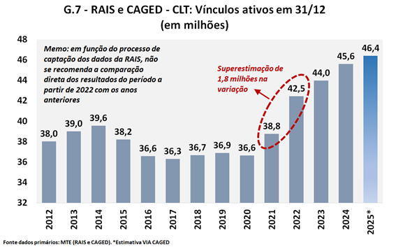 No gráfico é destacada também a quebra da série histórica citada anteriormente, pois ela se dá justamente na passagem de 2021 para 2022, e esse texto tem centrado a análise na comparação 2025-2021. Considerando os números reportados pela RAIS, houve nesse período um avanço de 7,6 milhões de vínculos (a diferença entre os 46,6 milhões de 2025 e os 38,8 milhões de 2021). Admitindo-se que a totalidade da subestimação da RAIS se referisse aos vínculos CLT aqui considerados, a base, em 2021, seria de 40,6 milhões de vínculos; a comparação do final de 2025 com 2021 resultaria em um saldo de 5,8 milhões de vínculos — um avanço de 14,3%.