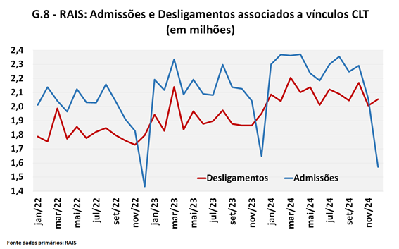 O número de vínculos observados em 31/12 é o resultado de um grande número de admissões e desligamentos ocorridos ao longo do ano — incluindo trabalhadores que são demitidos em um mês e conseguem se empregar em outro. O Gráfico 8 traz essas informações para o período 2022-2024; no triênio, a média mensal dos desligamentos foi de 1,9 milhão de ocorrências e a de admissões chegou a 2,1 milhões. Vale notar que, por questões metodológicas, não se obtém a variação do número de vínculos entre um ano e outro acumulando-se os fluxos.