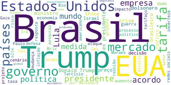 Em julho, quando as tensões externas foram mais direcionadas ao Brasil, a nuvem de palavras do IIE-Br composto por itens de natureza política destacou termos como: “Brasil”, “Trump”, “EUA”, “Tarifa” e “Estados Unidos”. A maioria deles relacionada a questões desencadeadas pela postura comercialmente agressiva dos EUA.