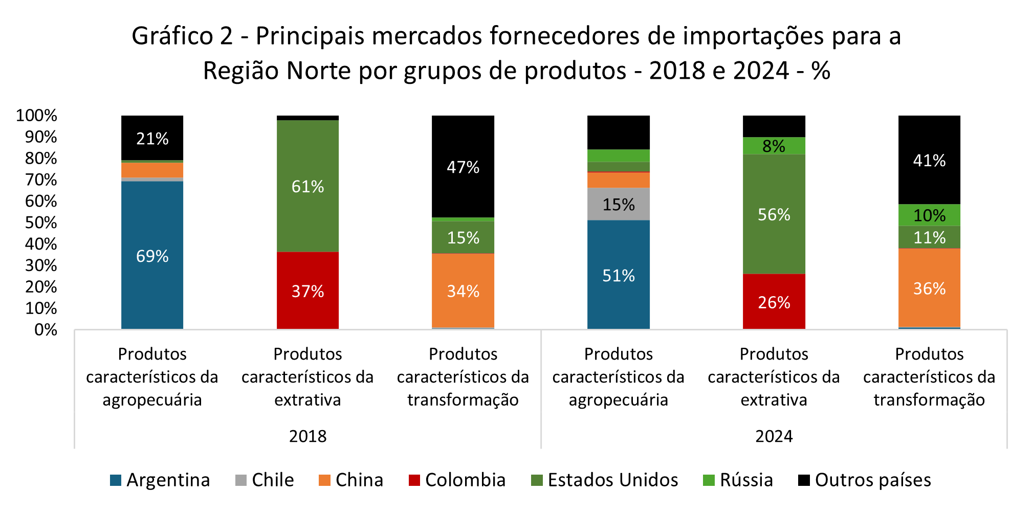 Nos produtos característicos da agropecuária, a Argentina destacou-se como fornecedora para a região Norte nos dois anos analisados, mas reduziu consideravelmente sua participação em 2024 devido ao aumento da relevância do Chile (era 2%, em 2018, e passou a ser 15%, em 2024) no fornecimento de produtos referentes a pesca e a aquicultura.