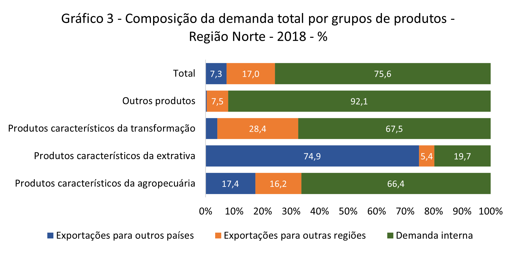 O somatório das exportações para outros países e outras regiões do país representaram 24,4% da demanda por produtos da região Norte em 2018, como mostra o Gráfico 3.
