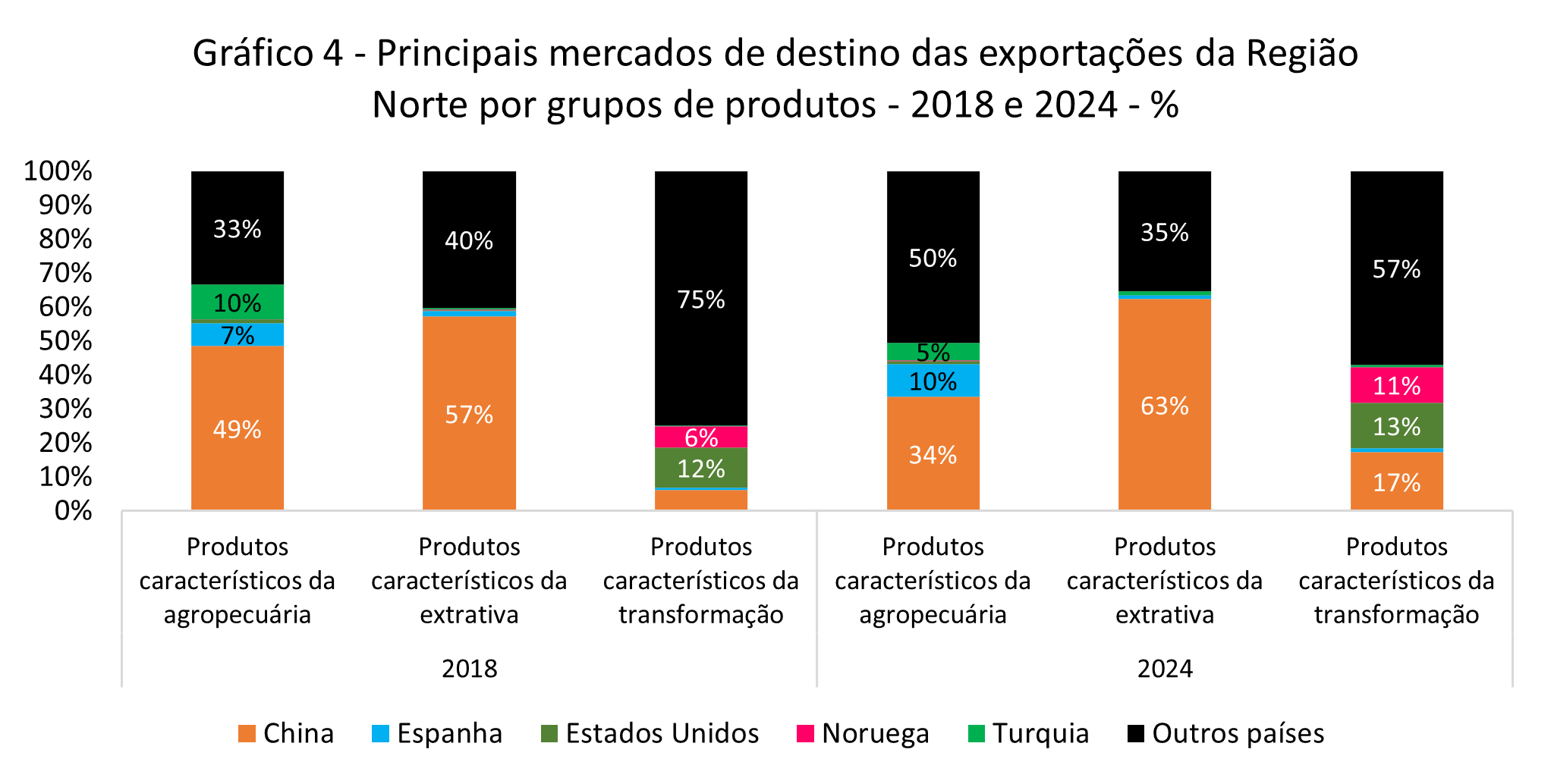 Nas exportações da região, o grande destaque são os produtos característicos da extrativa, principalmente explicado pela mineração no Pará. Essas exportações têm destinação principal os outros países, onde o protagonismo chinês prevalece. Além da extrativa, cabe mencionar que o perfil exportador de produtos característicos da agropecuária é bastante particular, já que há produções brasileiras que são majoritariamente realizadas em solo nortista, como é o caso do açaí, do dendê, do cumaru, do pequi, do cacau e do guaraná, por exemplo. Novamente a China mostra uma forte relação comercial com a região nestes tipos de produtos, sendo ela a principal destinação internacional dessas exportações.