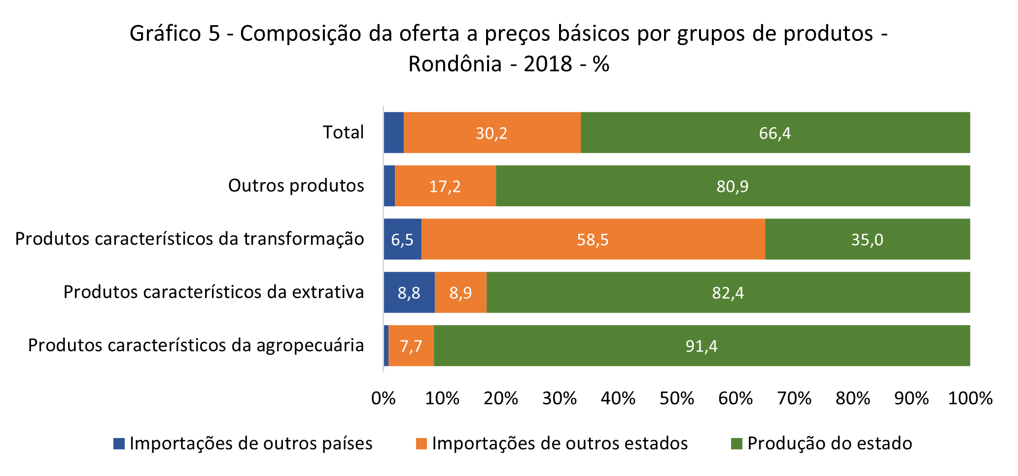 O Gráfico 5 mostra que pouco mais de 30% da oferta de produtos de Rondônia, em 2018, foi atendida por importações, sendo a maior parte, provenientes de outros estados (30,2%).