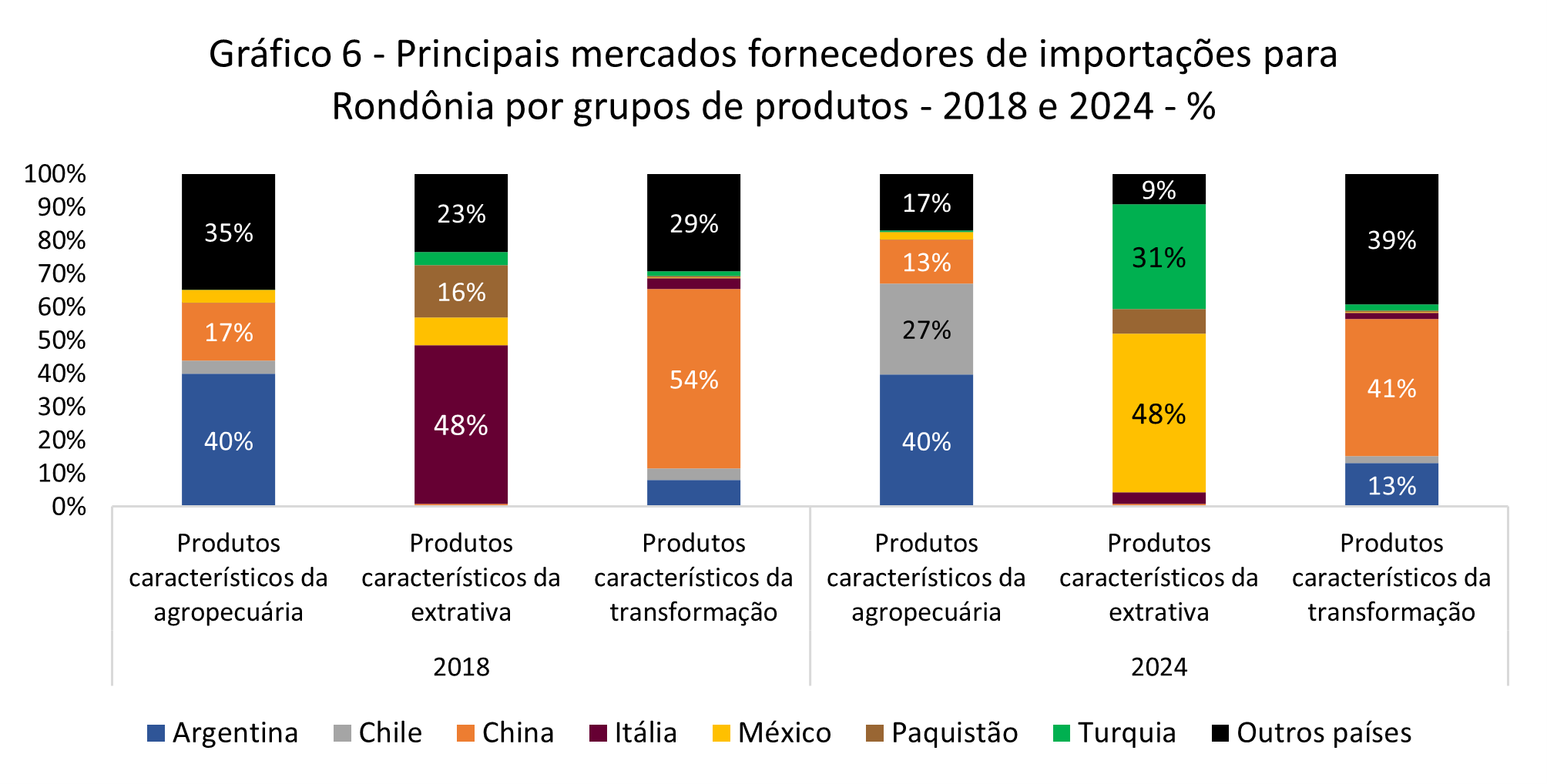 A pauta de importações internacional de Rondônia, apresentada no Gráfico 6, mostra que a Argentina é o principal parceiro do estado em produtos característicos da agropecuária e, que a China também tem relevância. Nos dois casos, isto deve-se a aquisição de produtos da agricultura e da pecuária. Com relação ao Chile, o considerável aumento de sua participação nessa pauta de importações do estado, em 2024 (27%), foi devido ao fornecimento de produtos da pesca e da aquicultura.