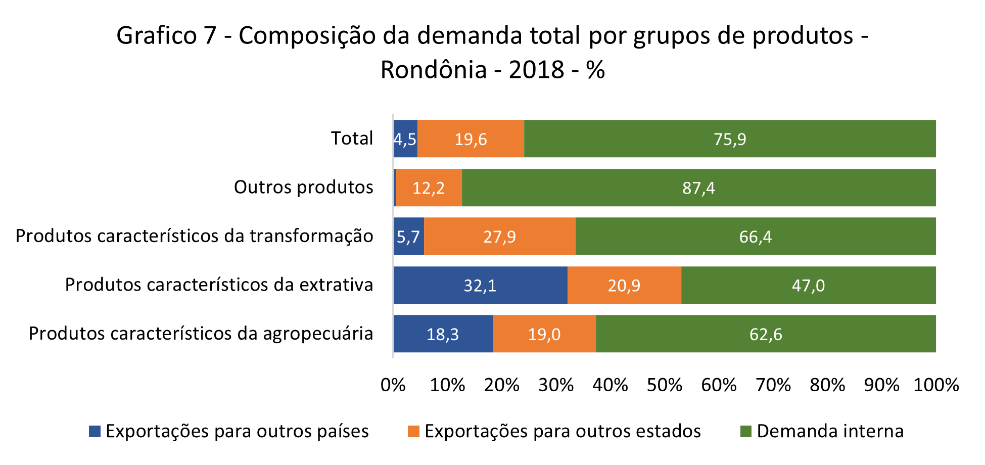Embora apenas cerca de 25% da demanda total de Rondônia referiu-se as exportações, em 2018, como apresentado no Gráfico 7, houve percentuais elevados em determinados grupos analisados, como os de produtos característicos da extrativa (51%) e da agropecuária (37,3%).