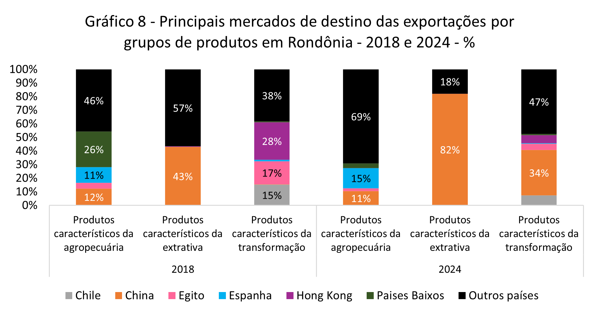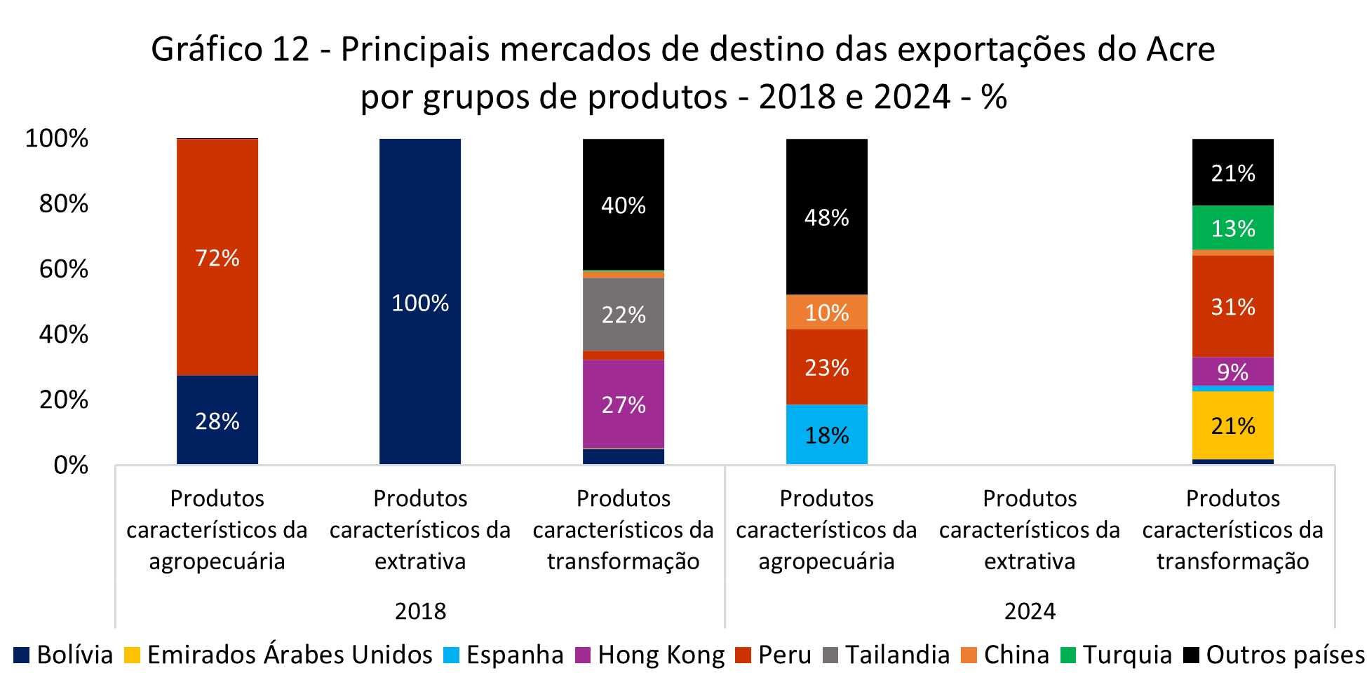 Nos produtos característicos da transformação, houve bastante diversificação na destinação da pauta acreana entre 2018 e 2024, com grande protagonismo dos produtos alimentícios para a Tailândia e Hong Kong, em 2018, e para os Emirados Árabes, o Peru e a Turquia, em 2024. Cabe pontuar que além desses produtos, a exportação internacional de produtos de madeira foi a segunda principal do estado, embora com destinações variadas.