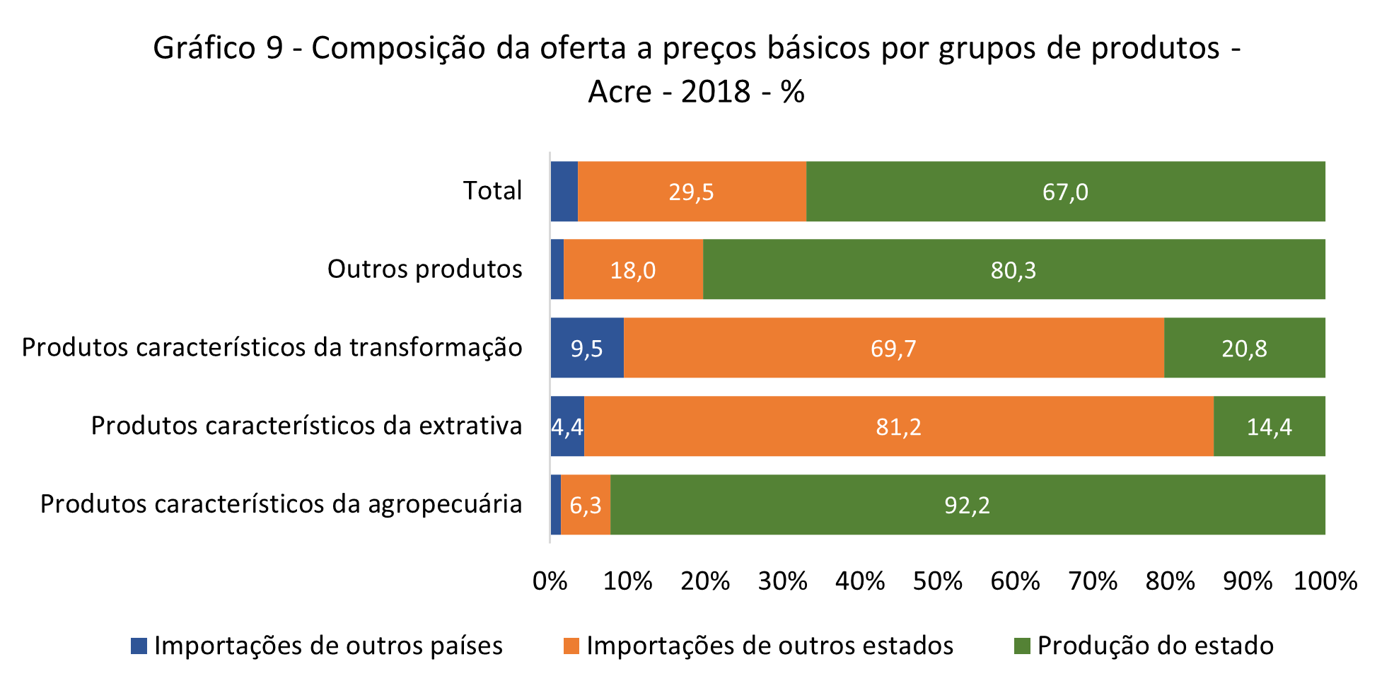 O Acre importou mais de 30% da sua oferta de produtos, em 2018, sendo 29,5%, proveniente de outros estados e, 3,5%, de outros países, como mostra o Gráfico 9. As importações de produtos característicos da extrativa (85,6%) e da transformação (79,2%) foram bastante expressivas nas suas respectivas ofertas, sendo, em ambos os casos, a principal origem em outros estados. Nesse sentido, ressalta-se que o maior fornecimento da produção própria do estado na composição de sua oferta foi em produtos característicos da agropecuária.