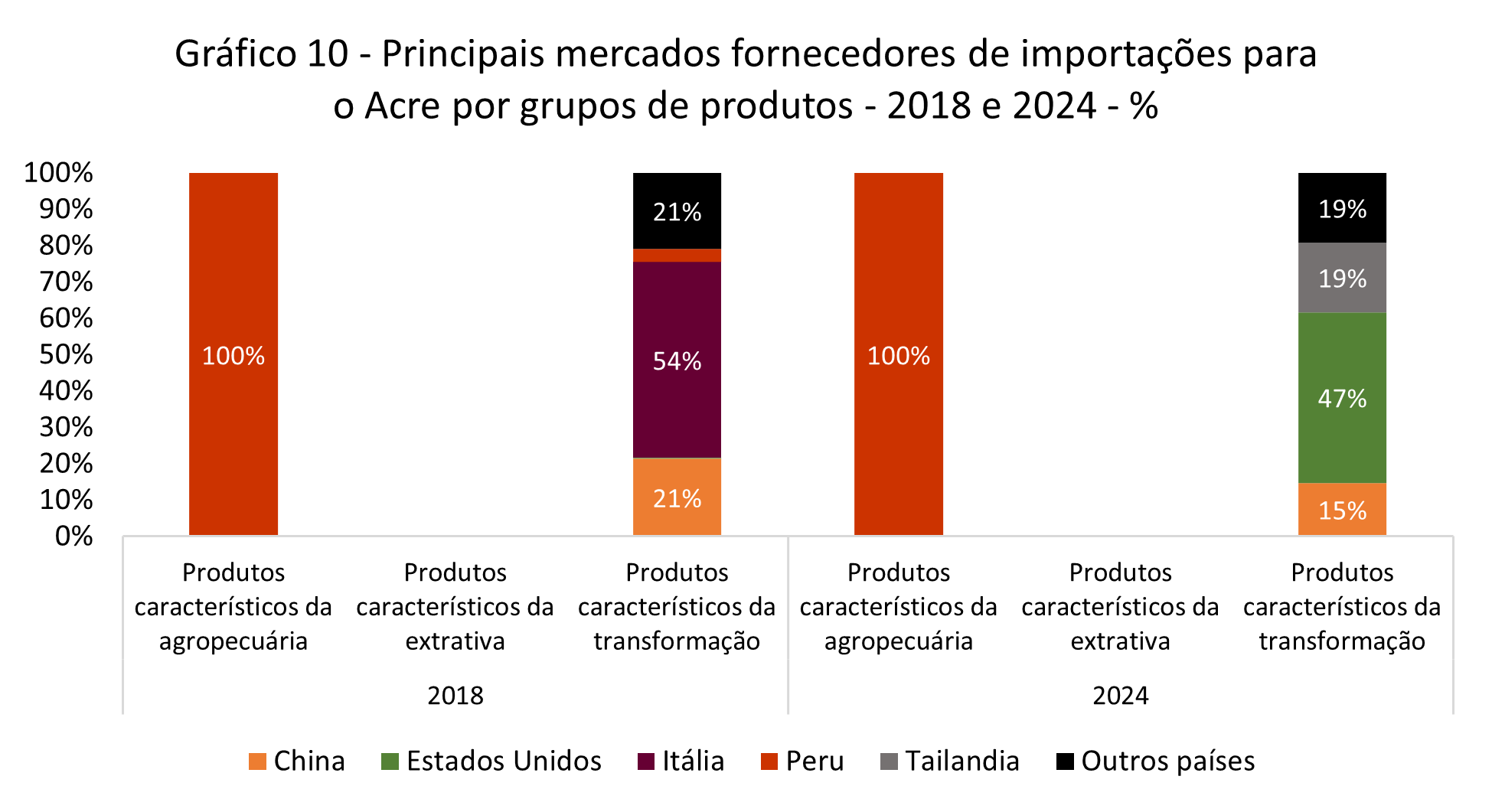 Nos produtos característicos da transformação, o principal produto importado pelo estado foram os químicos. O Acre tinha a Itália e a China como principais fornecedores em 2018, porém, em 2024, já diversificou para Estados Unidos e Tailândia.