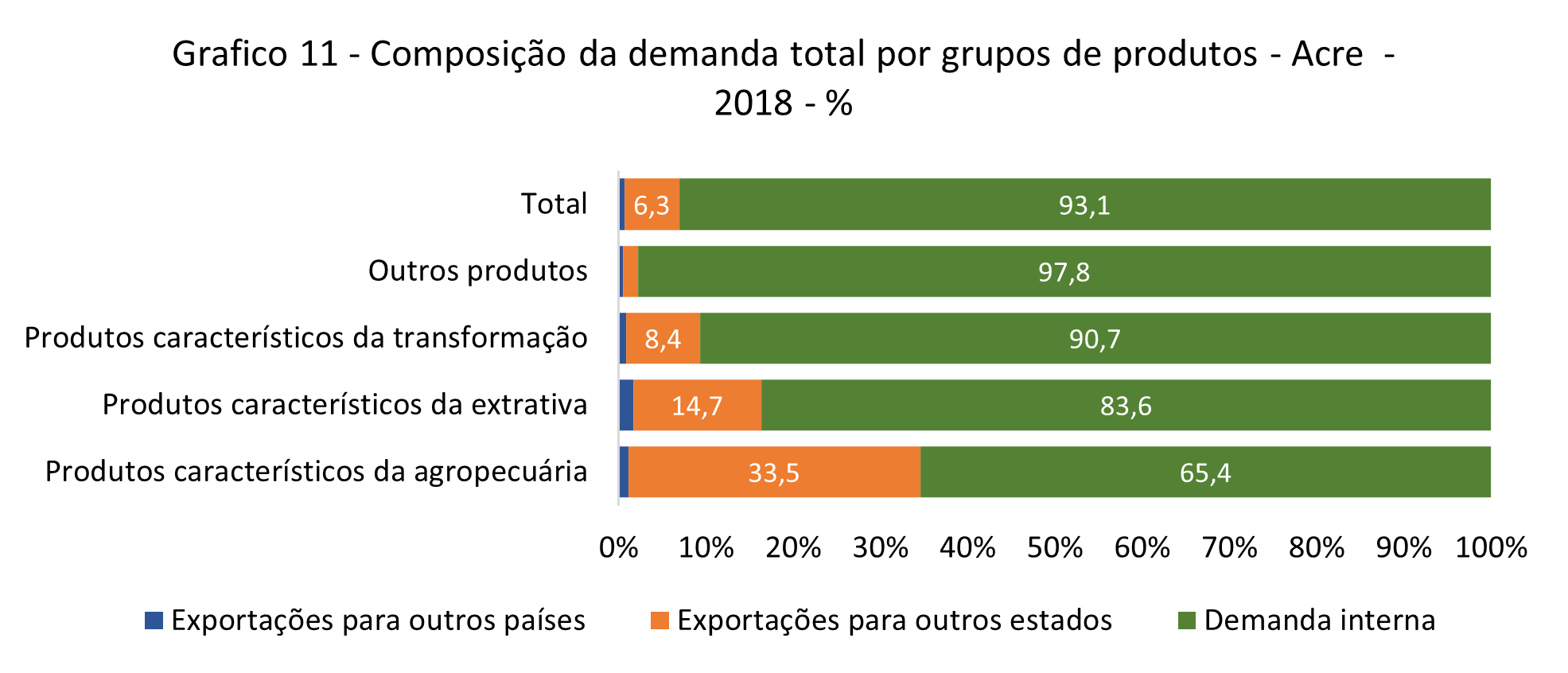 As exportações do Acre são principalmente de produtos característicos da agropecuária com destino para outros estados do país. Segundo o Gráfico 11, quase não há exportação acreana para outros países.