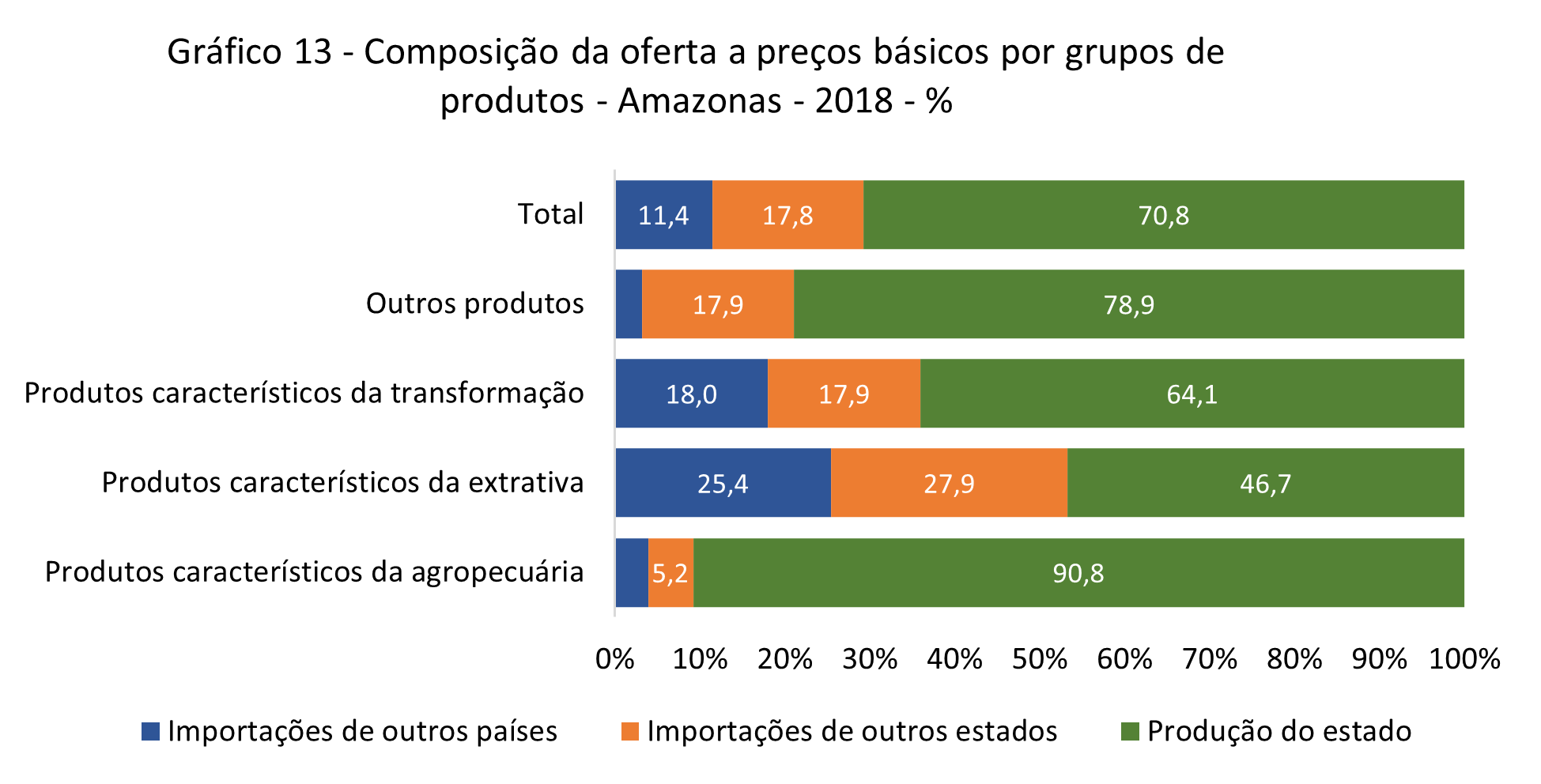 A maior parte da oferta de produtos do Amazonas deve-se a própria produção do estado (70,8%). Da parcela importada, a principal origem são os demais estados do país, como pode ser visto no Gráfico 13. Os produtos que apresentaram as maiores parcelas de importações nas suas ofertas foram os característicos da extrativa (acima de 50%).