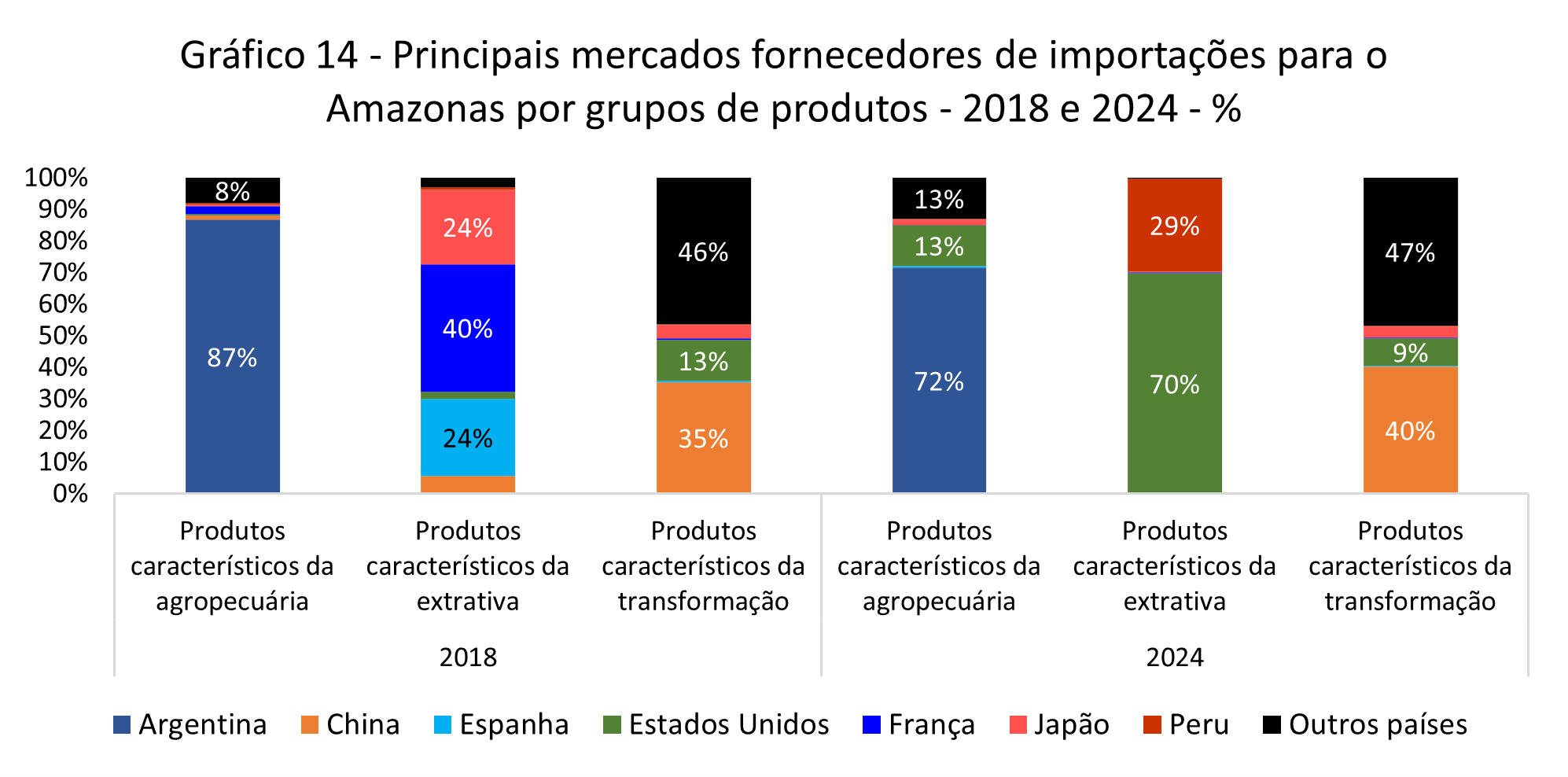 As importações internacionais do estado, referente a produtos característicos da agropecuária, tiveram como origem principal a Argentina. Nos produtos característicos da extrativa, embora a França, a Espanha e o Japão tenham sido parceiros importantes, em 2018, isto não se repetiu em 2024. Neste ano, os Estados Unidos e o Peru foram responsáveis por praticamente toda a importação internacional desses tipos de produtos do Amazonas.