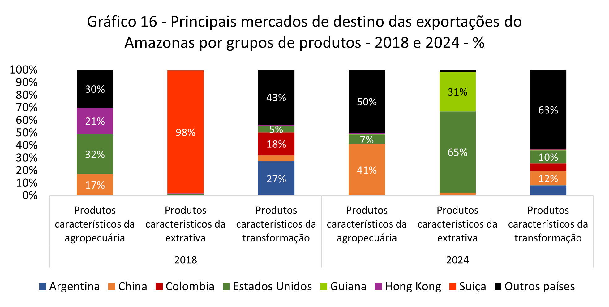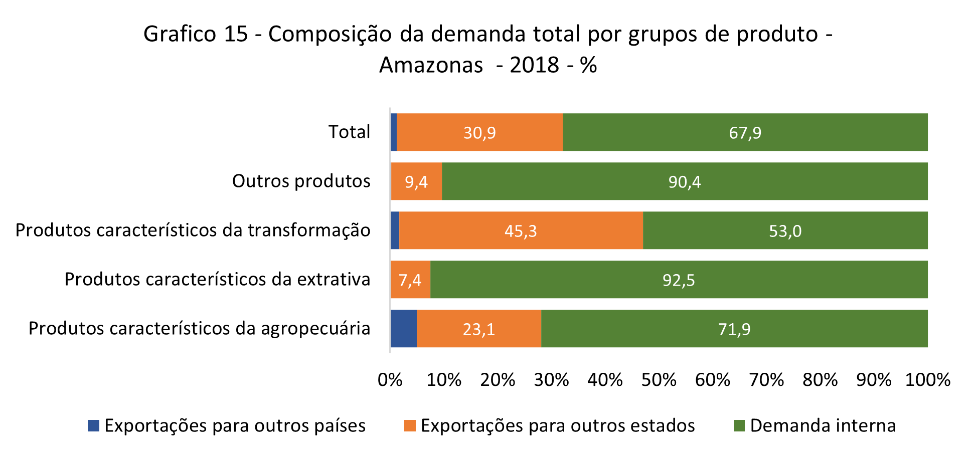 A maior participação das exportações na demanda refere-se aos produtos característicos da transformação e, neste setor, o Amazonas se destaca na produção nacional de determinados produtos que podem justificar esse elevado percentual, tais como equipamentos de informática, produtos eletrônicos e ópticos (43%), equipamentos de transporte (42%) e bebidas (8%), segundo dados da PIA de 2023.