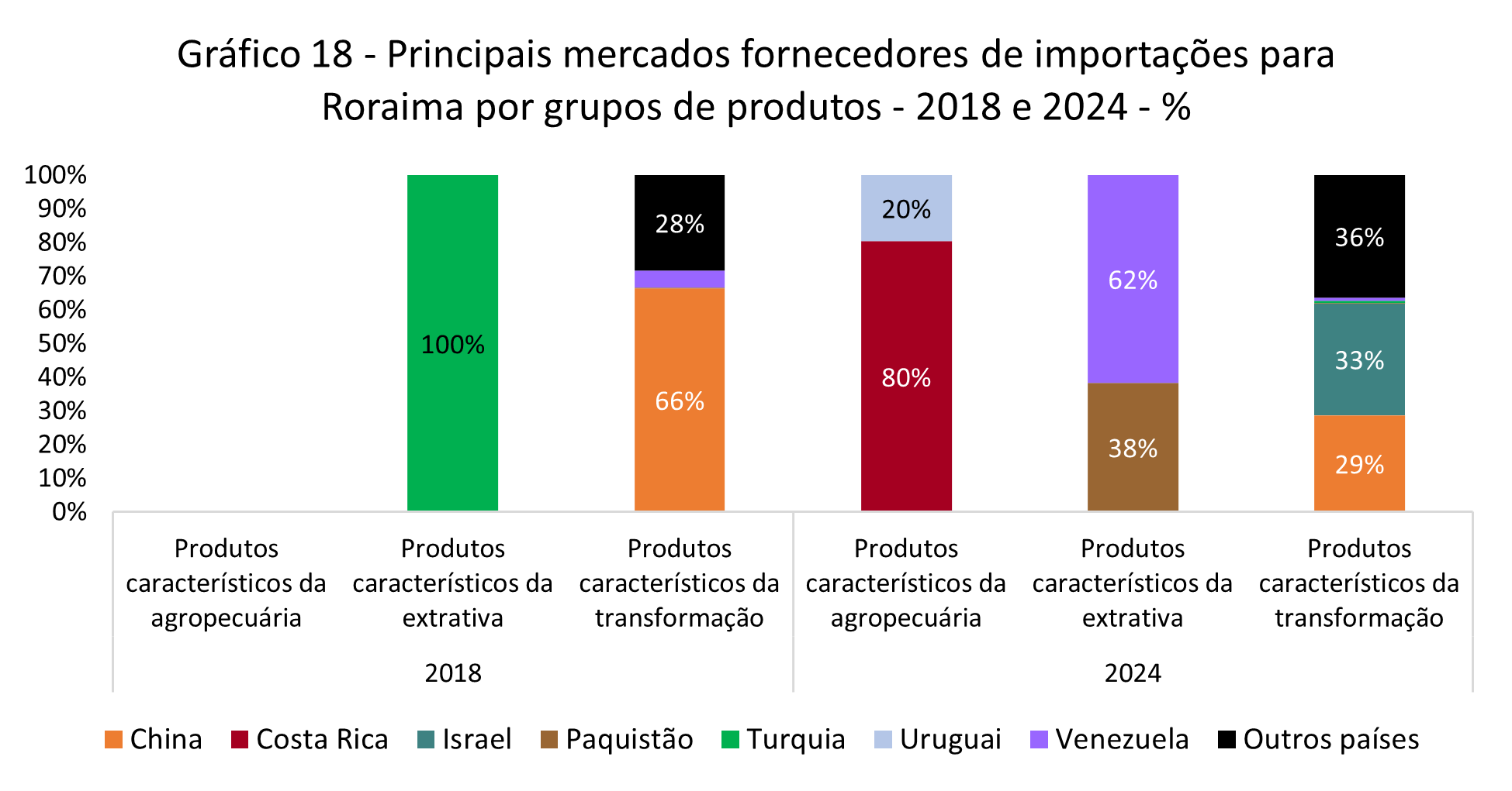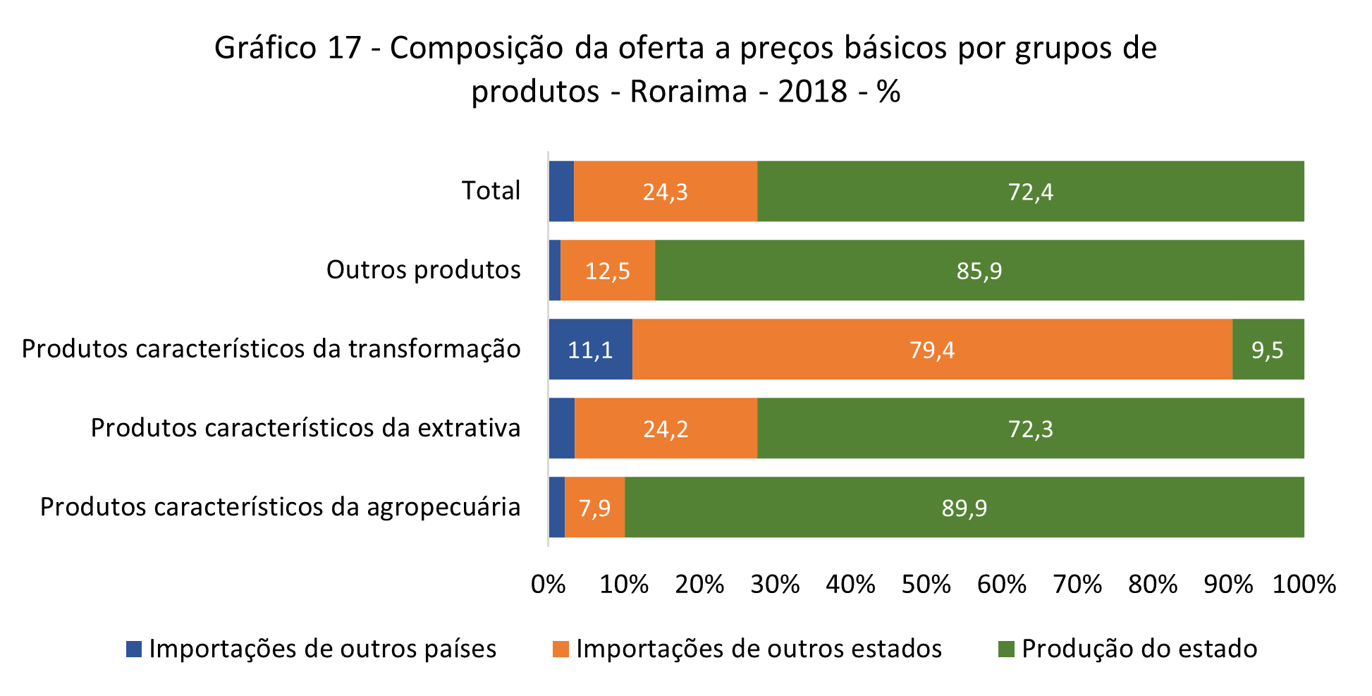 Roraima importou cerca de 30% da sua oferta de produtos, em 2018, com origem, principalmente, em outros estados (24,3%), seguida de outros países (3,3%). A principal importação do estado refere-se aos produtos característicos da transformação, em que mais de 90% da oferta foi gerada fora do estado, conforme mostra o Gráfico 17.