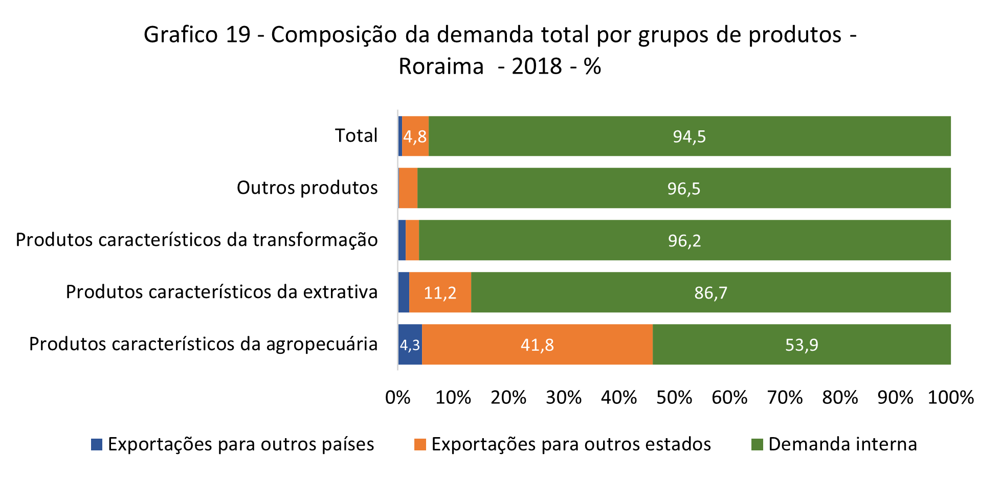 Nota-se, pelo Gráfico 19, que as exportações são pouco relevantes na demanda de Roraima. O maior destaque foram os produtos característicos da agropecuária, onde a principal destinação foi para outros estados do país (41,8%). Cabe destacar, segundo a PAM de 2024, que a soja foi responsável por metade do valor da produção agrícola de Roraima.