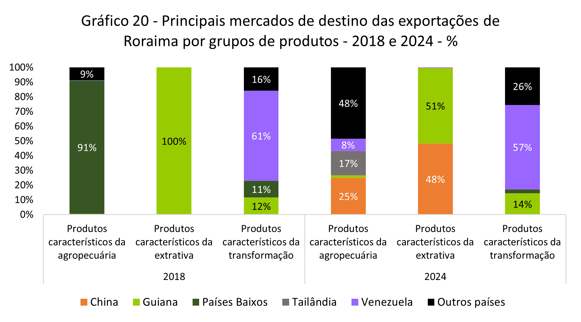 Como mostra o Gráfico 20, a China, que em 2018 quase não era uma destinação das exportações internacionais roraimenses, passou a ser, em 2024, em produtos característicos da agropecuária e da extrativa.