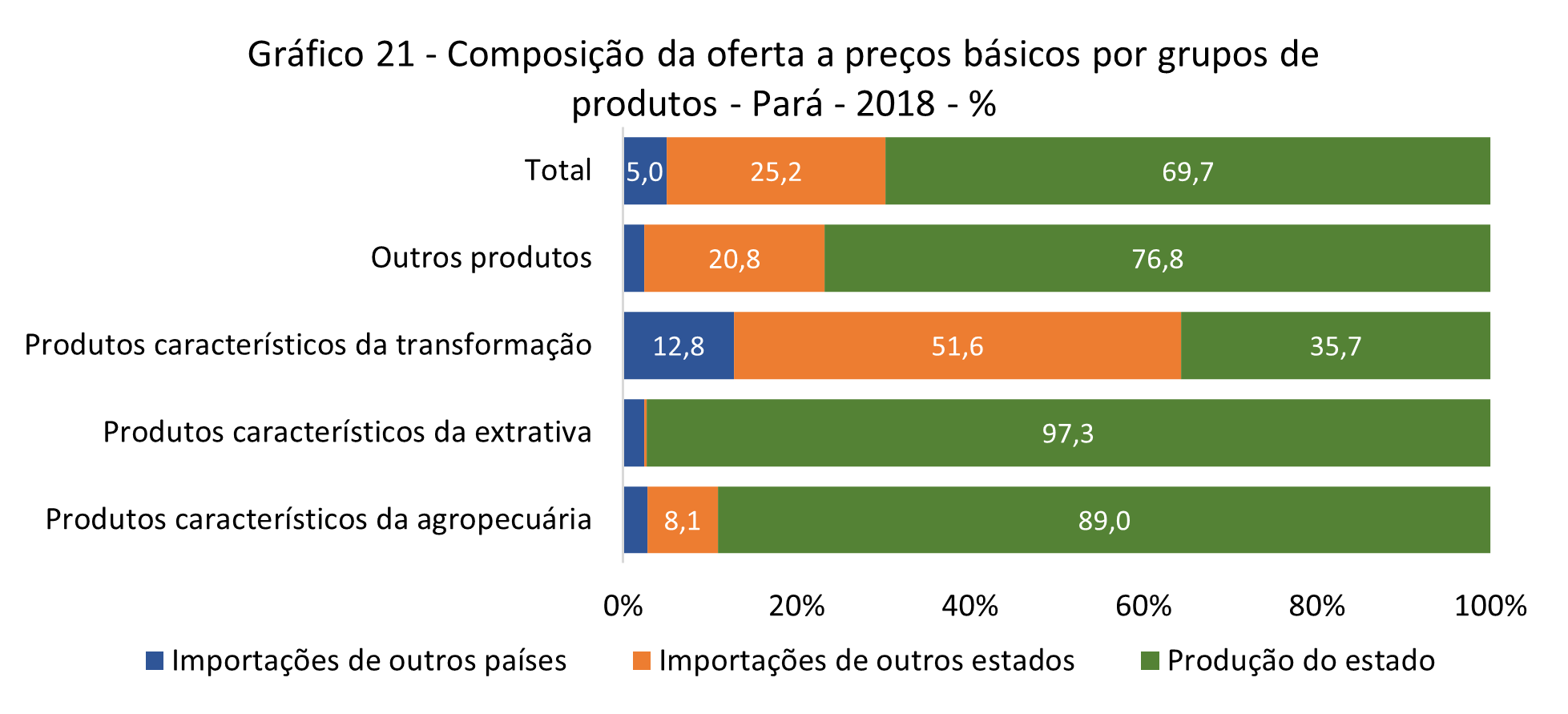 No caso do Pará, praticamente 70% de sua oferta foi produzida no próprio estado, e a maior parte das importações (25%) foi proveniente de outros estados do país. A importação de produtos característicos da transformação chama atenção por representar mais de 60% do total ofertado desses produtos no estado.