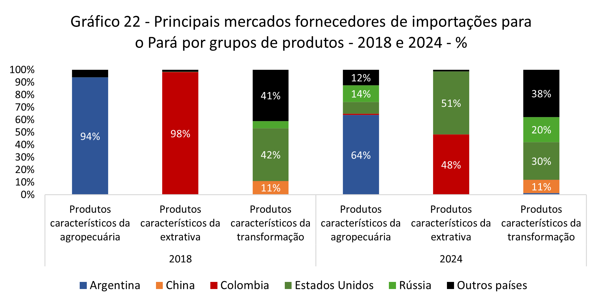 A Argentina se destaca como a principal fornecedora internacional de produtos característicos da agropecuária para o Pará, tanto em 2018 (94%), como em 2024 (64%).