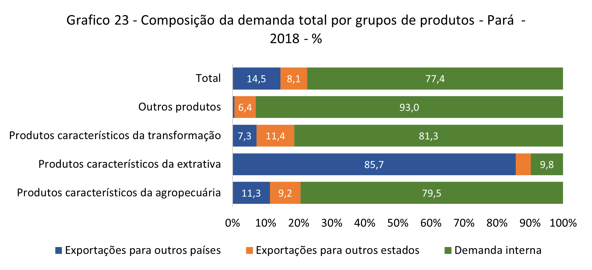 Pelo Gráfico 23, nota-se que os principais produtos exportados pelo Pará são os característicos da extrativa, com principal destinação para outros países (85,7% da demanda total desses produtos). Isto é explicado pela relevância do estado na produção nacional de produtos minerais metálicos (minério de ferro), tendo respondido, segundo a PIA de 2018, por 43% do valor produzido nacionalmente desses produtos.