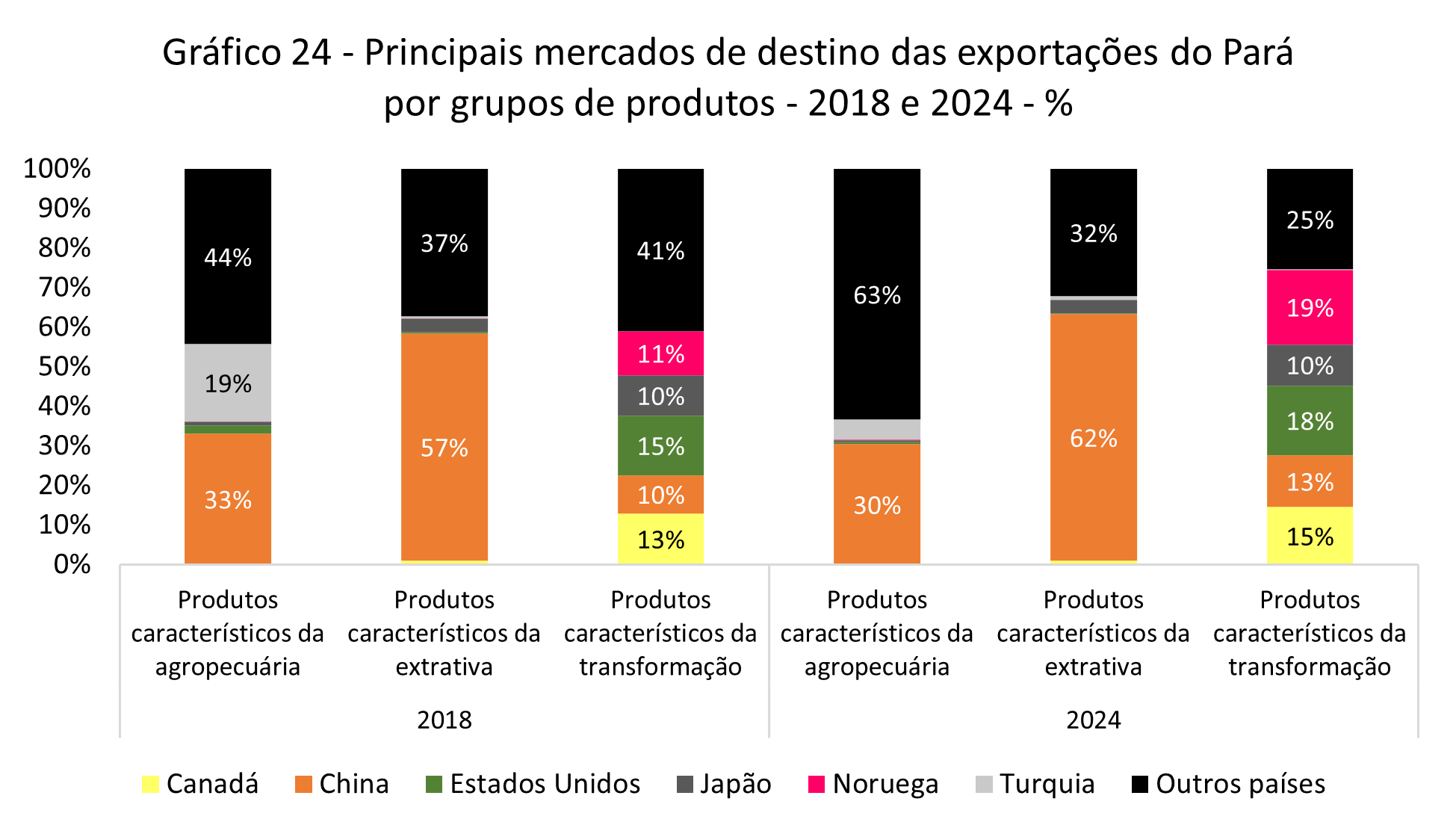 As exportações internacionais de produtos característicos da transformação já foram menos concentradas em destinações, embora tenham sido bastante concentradas em produtos. Na atividade de transformação do estado, segundo a PIA de 2023, 70% do valor produzido no estado foi em produtos alimentícios e metalúrgicos, o que, consequentemente, explica a pauta exportadora ser concentrada nesses produtos; em 2024, 87% das exportações internacionais do Pará deveram-se a eles.