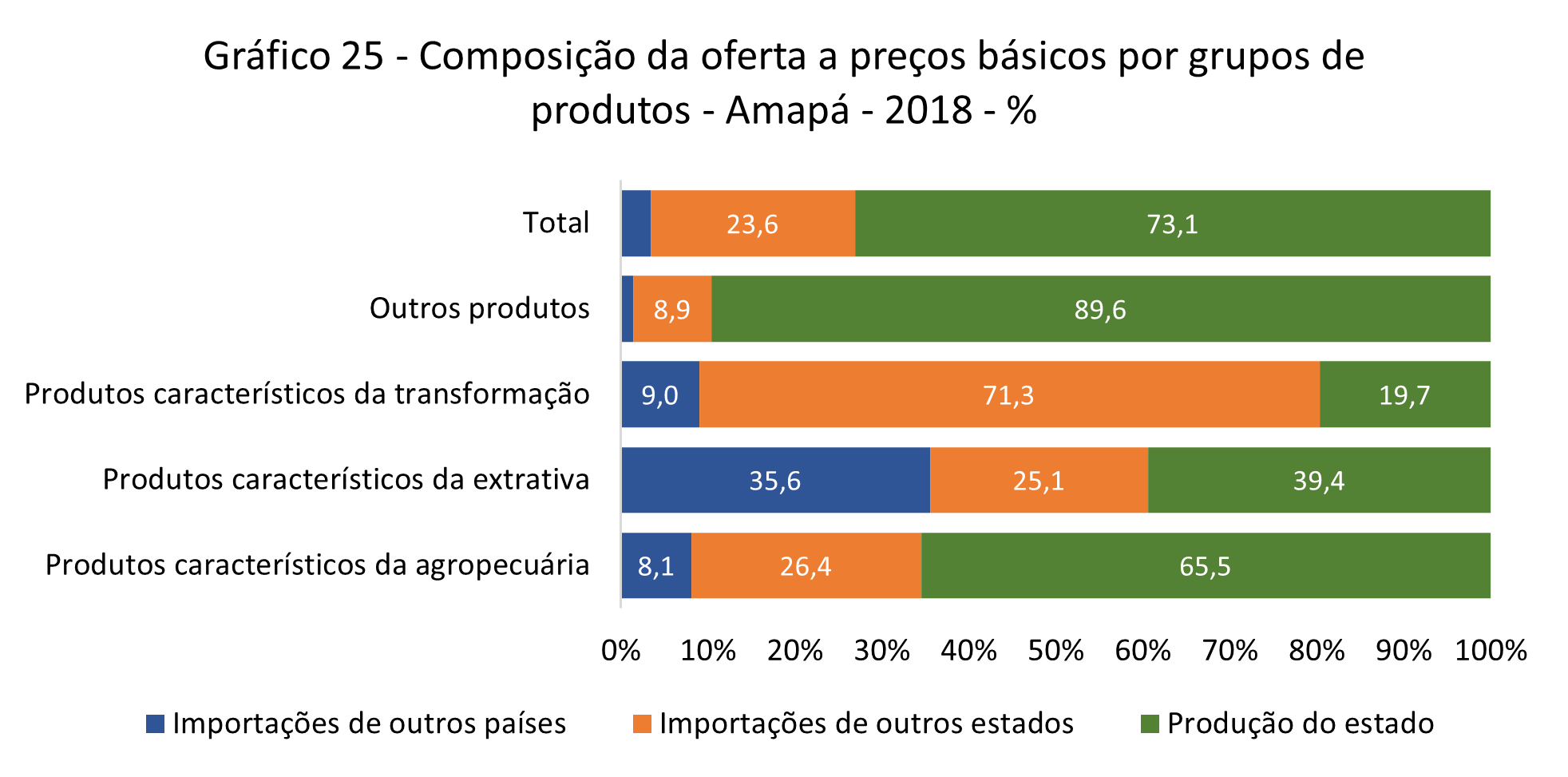 O Amapá produziu internamente 73,1% de sua oferta de produtos, em 2018 e, importou a outra parte, principalmente, de outros estados brasileiros (23,6%). Chama atenção o baixo percentual da produção de produtos característicos da extrativa e da transformação em suas respectivas ofertas, cujas importações foram responsáveis por mais de 60% de suas ofertas, como mostra o Gráfico 25.