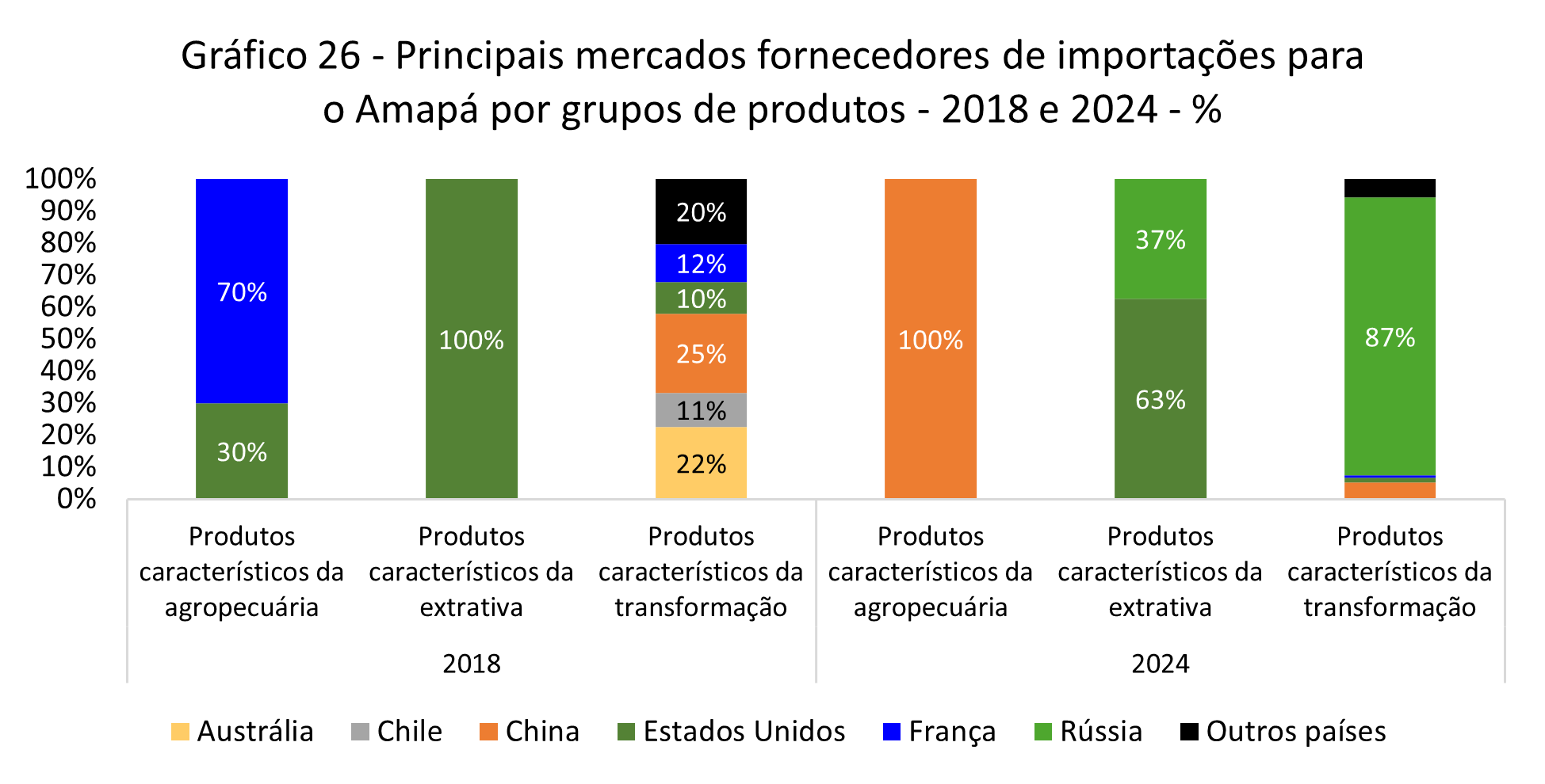 Na análise internacional da pauta importadora do Amapá, destaca-se o fato de ter havido mudanças significativas nos países fornecedores entre 2018 e 2024. Nos produtos característicos da agropecuária, toda a importação, em 2018, veio da França e dos Estados Unidos, já em 2024, a China foi a fornecedora internacional exclusiva desses produtos.