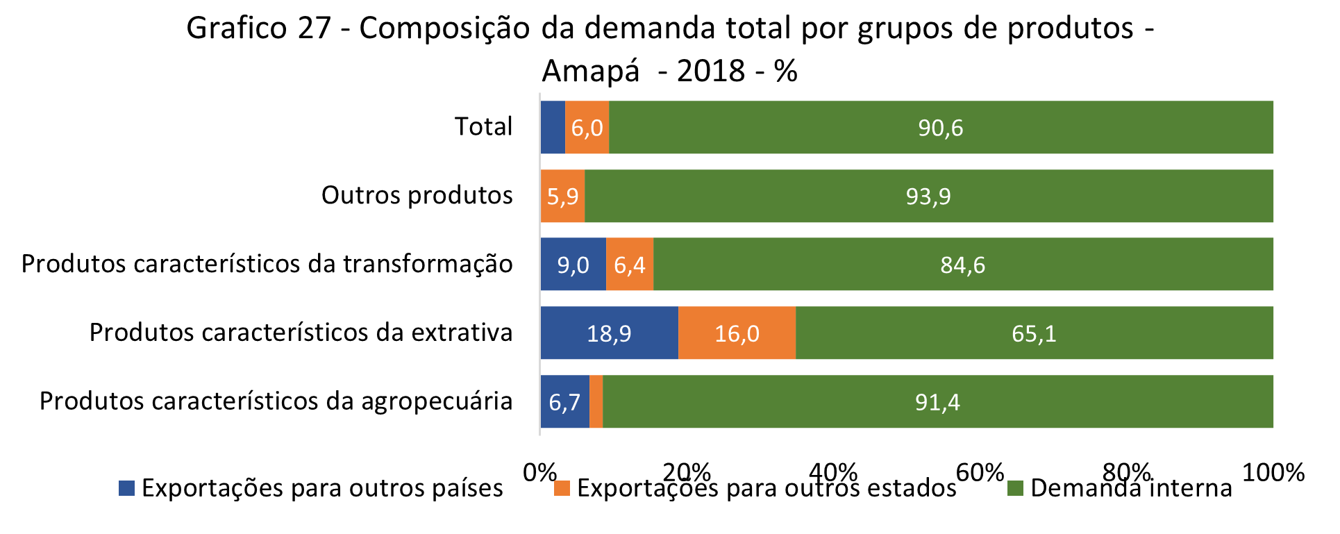 Os produtos característicos da extrativa são os que apresentaram maior percentual de exportação de sua demanda (cerca de 35%), sendo destinados tanto para outros estados quanto para outros países. Essas exportações referem-se a produtos minerais, dado que, segundo a PIA de 2023, de produtos característicos da extrativa, o Amapá produz, apenas estes.