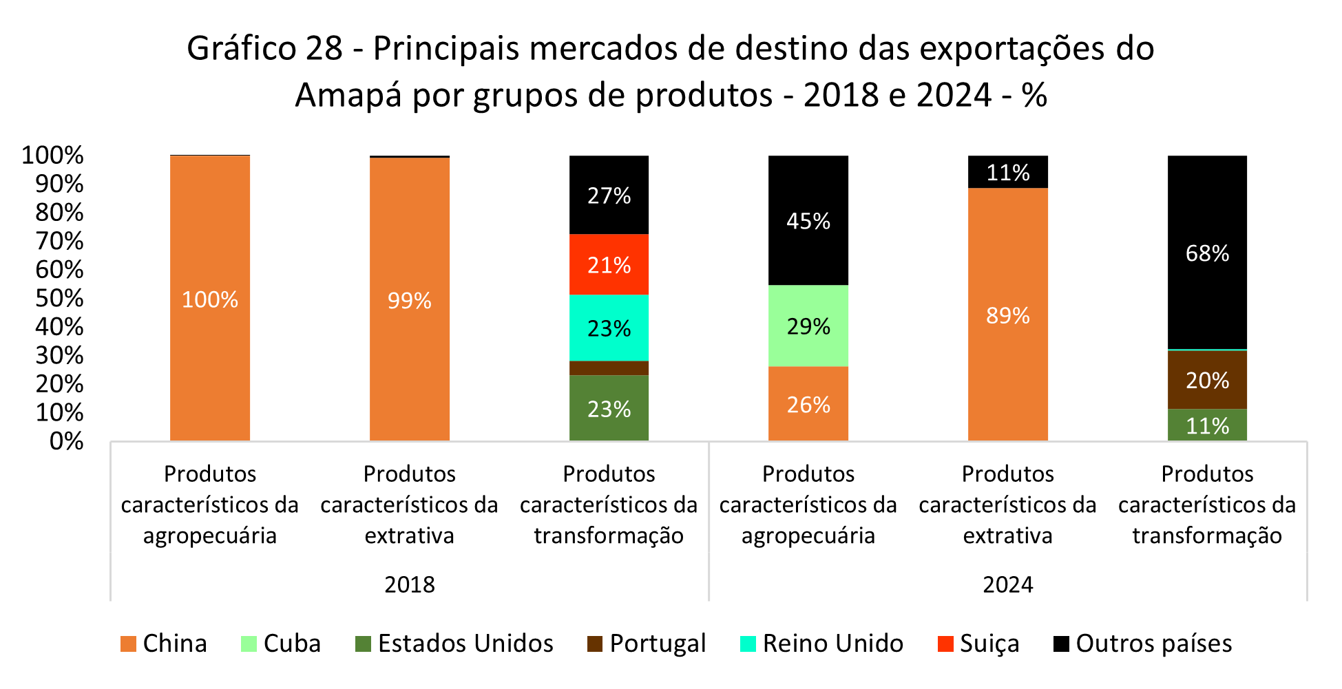 Nos produtos característicos da transformação, a totalidade da pauta é explicada por três tipos de produtos: alimentícios, de madeira e metalúrgicos. Nos produtos característicos da transformação, a totalidade da pauta é explicada por três: alimentícios, de madeira e metalúrgicos. Em 2018, Reino Unido e Suíça foram protagonistas na pauta do Amapá devido à exportação de produtos metalúrgicos. Nas exportações para os Estados Unidos, em 2018, além dos metalúrgicos, também houve exportações de alimentícios; em 2024, as destinações para este país foram apenas de alimentícios. No caso de Portugal as exportações amapaenses foram de produtos de madeira, tanto em 2018, quanto em 2024.