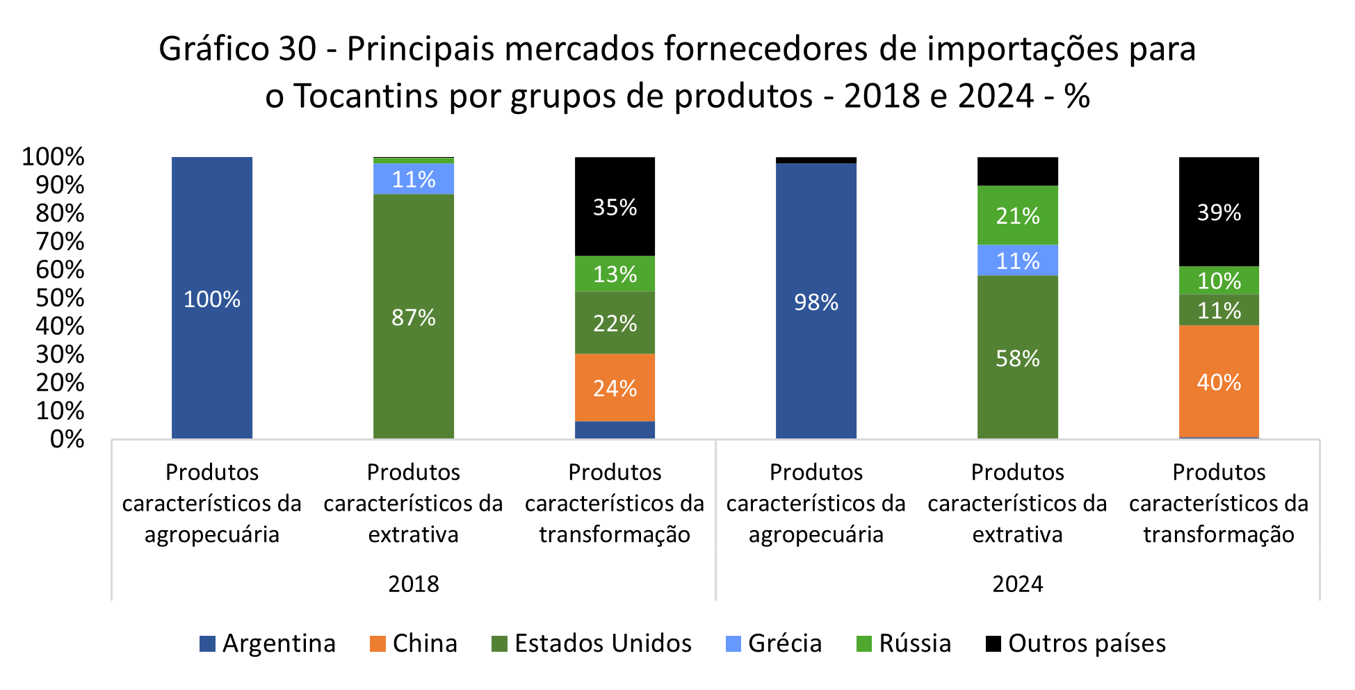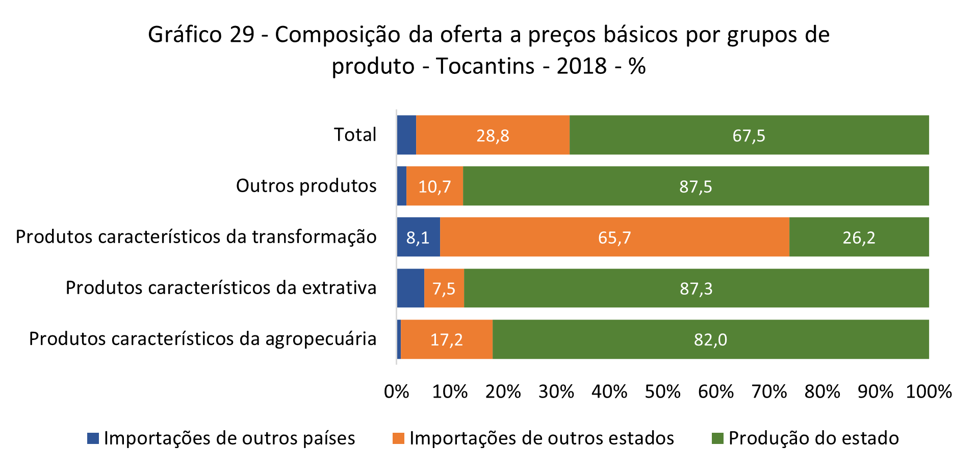 As importações representaram pouco mais de 30% da oferta de produtos do Tocantins, em 2018. Esse percentual é, principalmente, explicado pela dependência do estado por importações de produtos característicos da transformação (73,8% da oferta, sendo 65,7% de outros estados e 8,1% de outros países), como mostra o Gráfico 29.