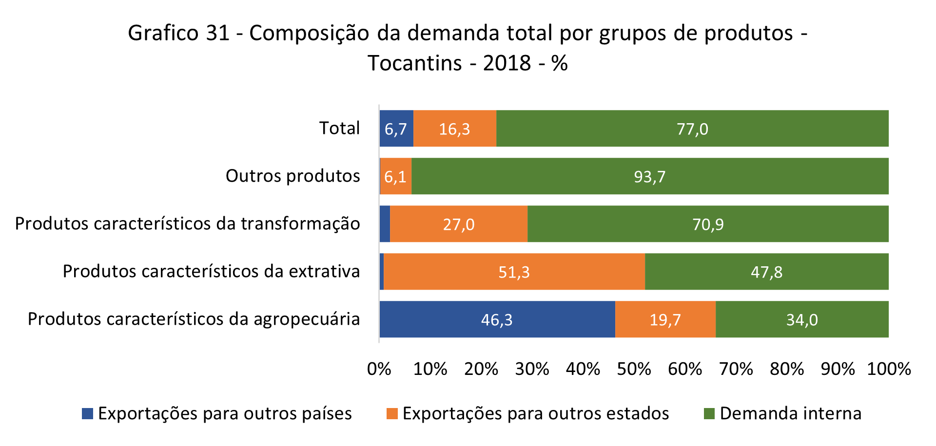 Em relação as exportações tocantinenses, elas representaram cerca de 23% da demanda total do estado, em 2018, sendo a maior parte destinada a outros estados do Brasil (16,3%), como mostra o Gráfico 31.