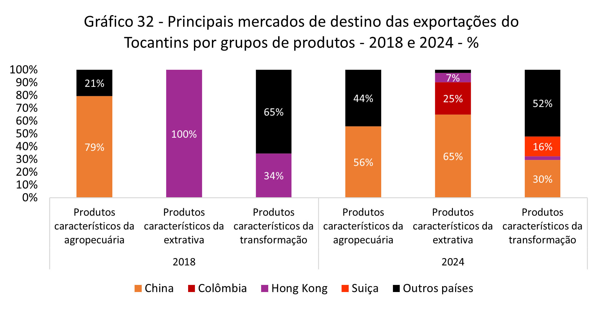 A pauta internacional de exportações do estado, apresentada no Gráfico 32, mostra que a China passou a ser o principal parceiro internacional do Tocantins, em 2024, nos três grupos de produtos analisados.