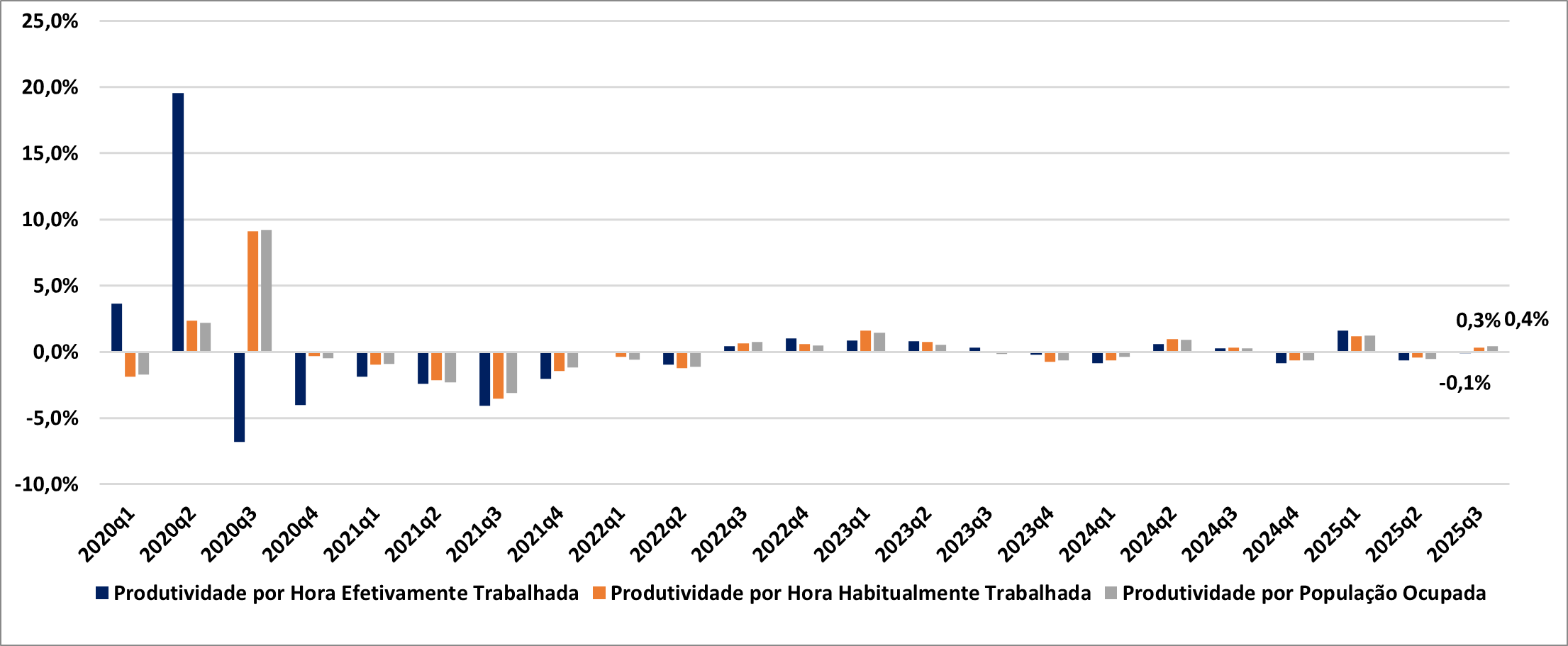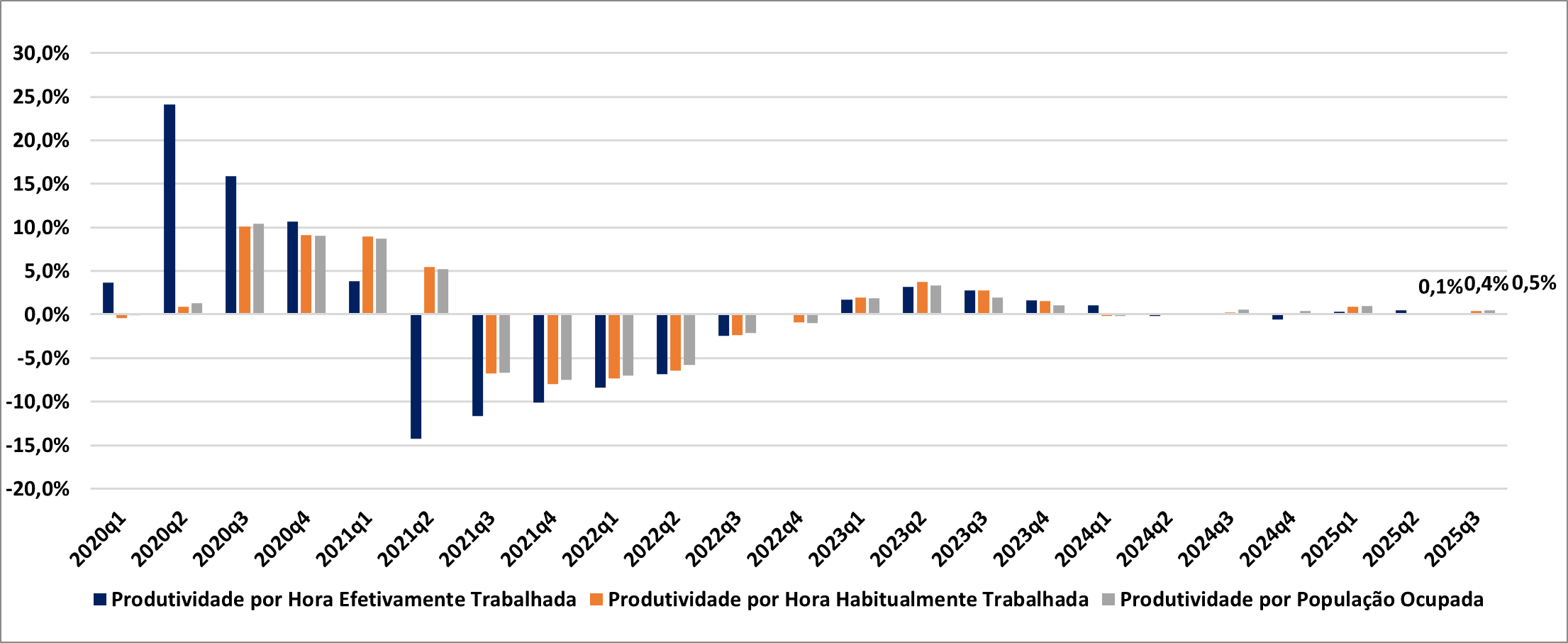 No terceiro tri de 2025, a métrica de produtividade do trabalho que considera as horas efetivamente trabalhadas apresentou crescimento interanual de 0,1%. Já as métricas que consideram as horas habituais e a PO cresceram 0,4% e 0,5%.