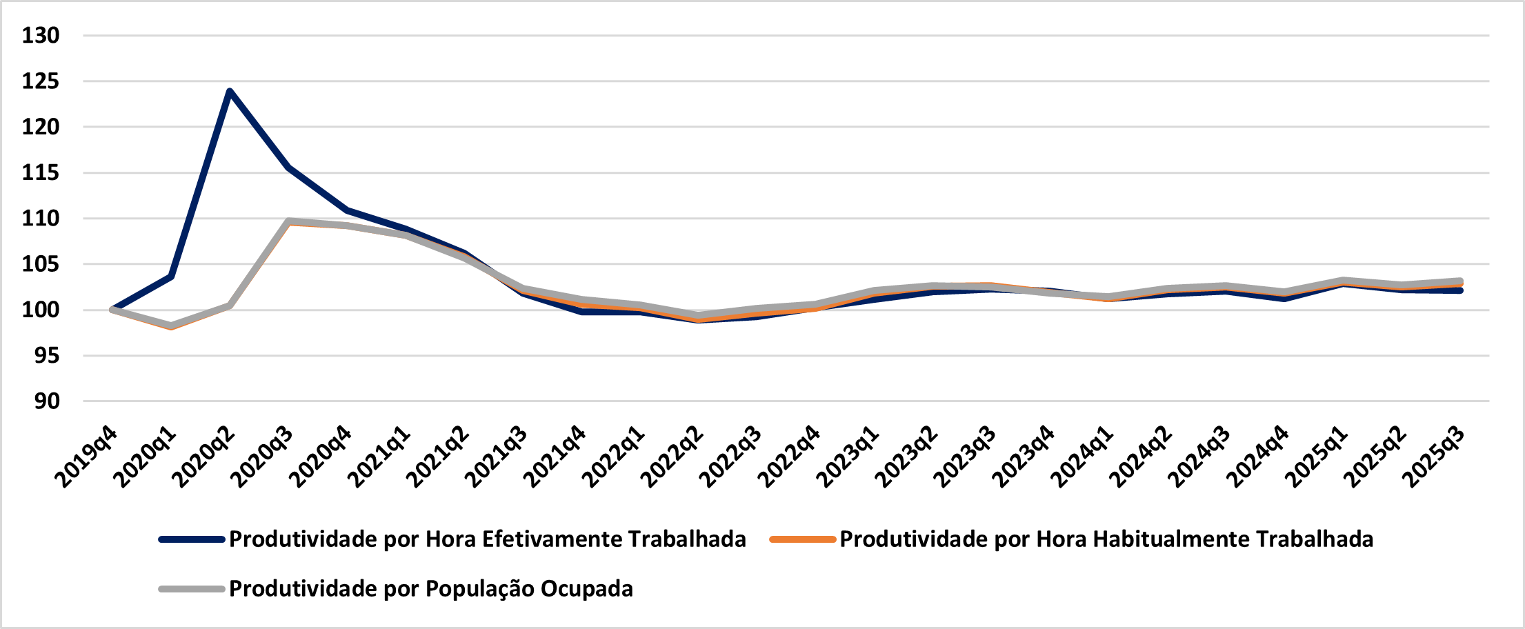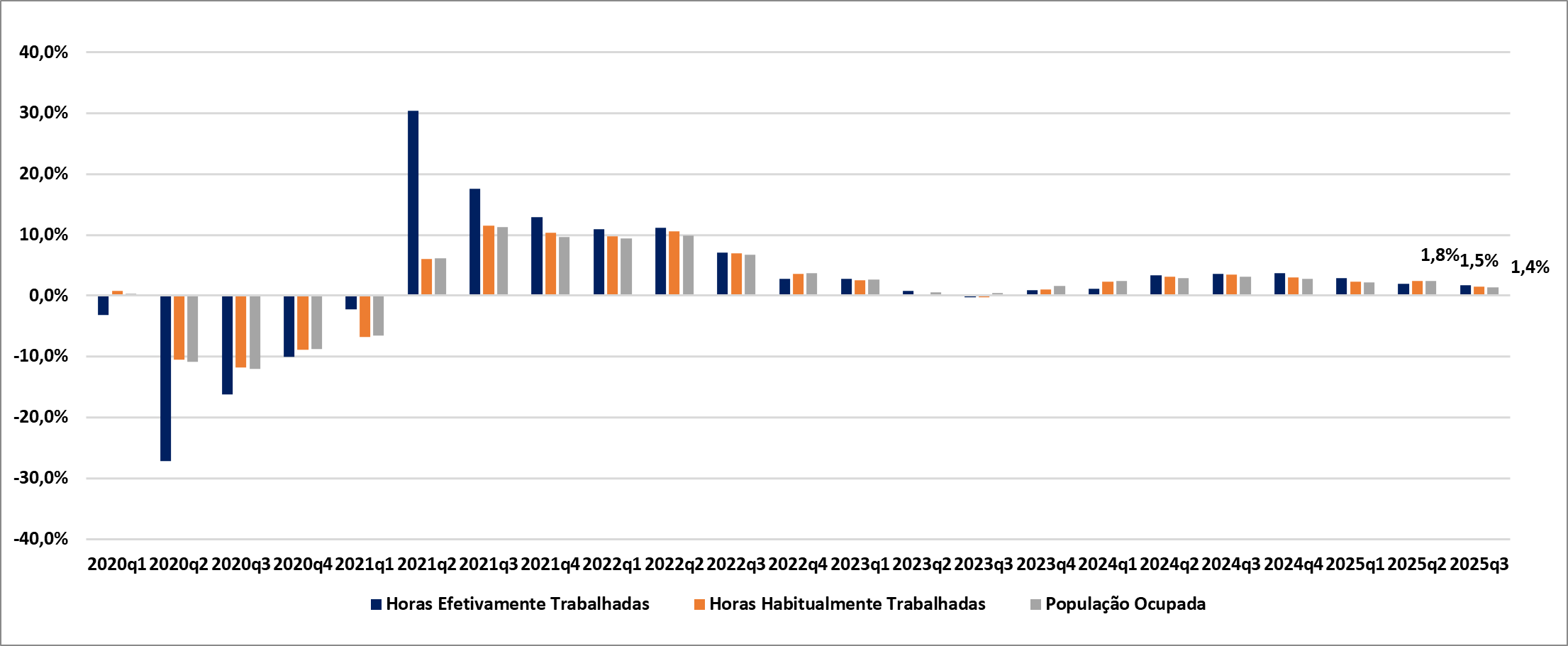 No terceiro trimestre de 2025, todas as medidas continuaram acima dos níveis observados no quarto trimestre de 2019. Em particular, no terceiro trimestre de 2025, a métricas que considera o total de horas efetivamente estava 2,1% acima do observado no quarto trimestre de 2019. Já as medidas que consideram a população ocupada e as horas habitualmente trabalhadas estava 3,1% e 2,9%, respectivamente, acima do período pré-pandemia.