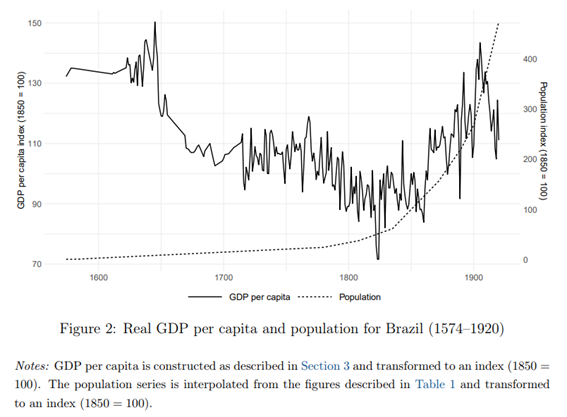 Em trabalho recentemente publicado, mas que já promete ser tremendamente influente, Nuno Palma e Guilherme Lambais constroem, pela primeira vez, uma longa série de PIB per capita para o Brasil começando no fim do século XVI. Os autores coletam um grande conjunto de dados de evidências arquivísticas primárias para construir séries de salários para trabalhadores qualificados e desqualificados e índices de preços de uma cesta de subsistência para construir uma série de salário real.