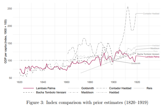 “The main differences emerge after 1900. Our series rises to roughly 125–130 in the early 1910s, retreats to around 100 during World War I, and ends the period slightly above 110. Three of the comparison series—Maddison, Haddad, and Reis—follow a similar post-1900 trajectory but reach somewhat higher levels in the 1910s. The sharpest divergence is observed for Contador Haddad, which exhibits a higher level throughout and a pronounced wartime spike above 250 that has no counterpart in our estimates or in any of the other series, likely due to the inclusion of cement consumption and installed energy capacity. Bacha Tombolo Versiani tracks our series most closely throughout.”